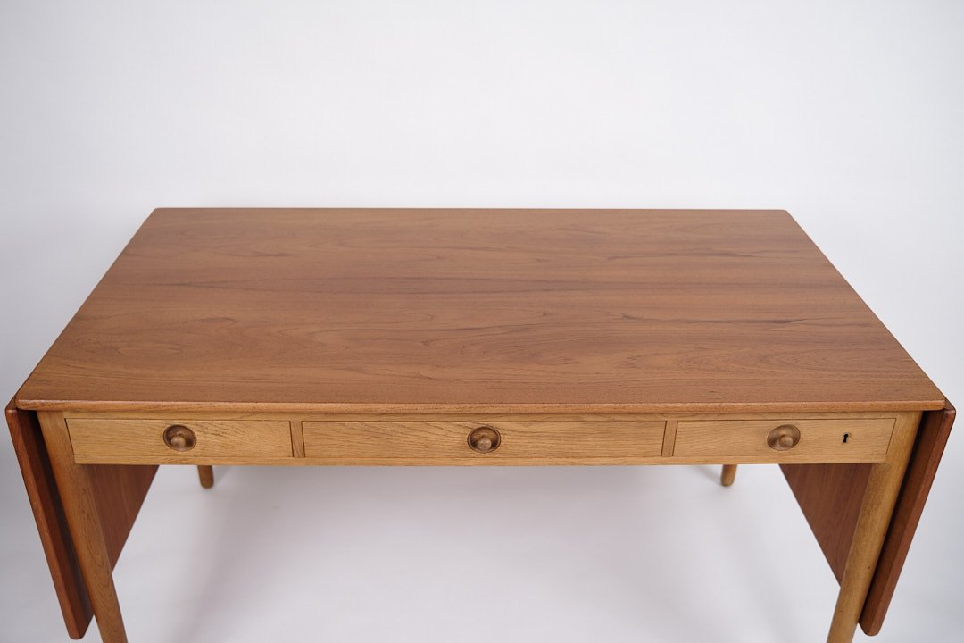 Kontakt os vedrørende prisSkrivebord med klapper, model AT-305, designet af Hans J. Wegner og produceret af Andreas Tuck i 1950’erne. Bordet er udført i teak med ben i eg og kan udvides fra 135 cm til hele 229 cm ved hjælp af to klapper, hvilket gør det både funktionelt og fleksibelt.