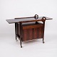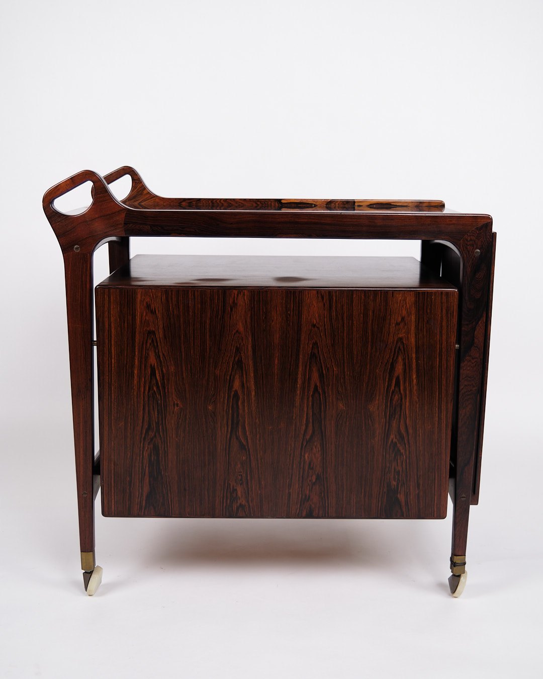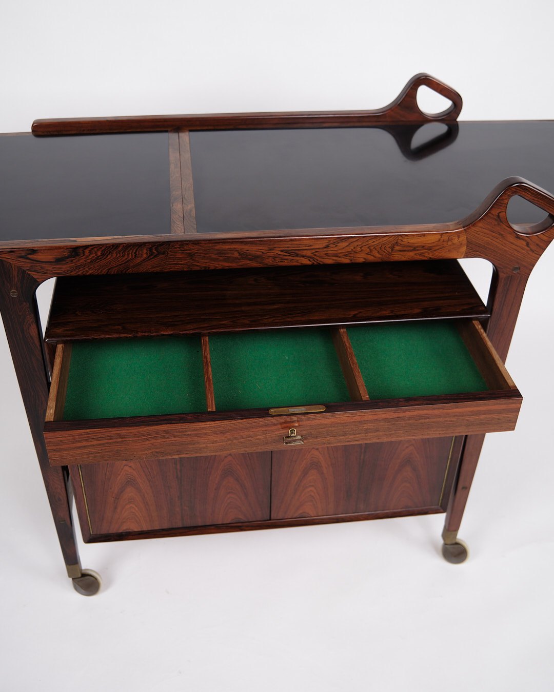 barskab fra Dyrlund, udført i palisander med sort formika og håndtag i massiv palisander. Skabet er monteret på hjul for nem mobilitet og har en foldbar plade, der kan udvide bredden fra 86 cm til 142 cm. Kombinationen af eksklusive materialer og funktionelt design gør dette barskab til et klassisk eksempel på dansk møbelhåndværk fra 1960’erne.