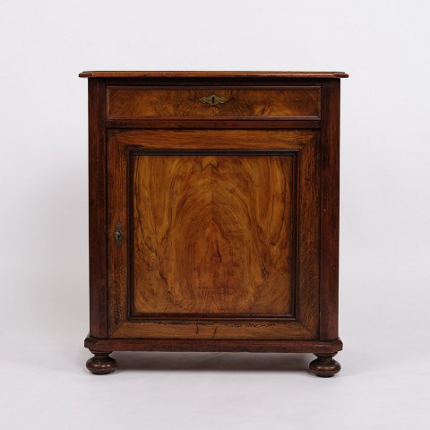 Lille antikt konsol-/entréskab fra 1880’erne. Mahogni og nøddetræ med runde ben.