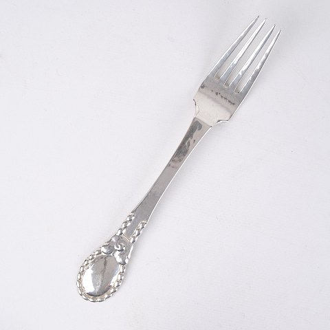Middagsgaffel i mønster nr. 13 af Evald Nielsen. Tretårnet sølv, stemplet. Klassisk dansk sølvdesign.