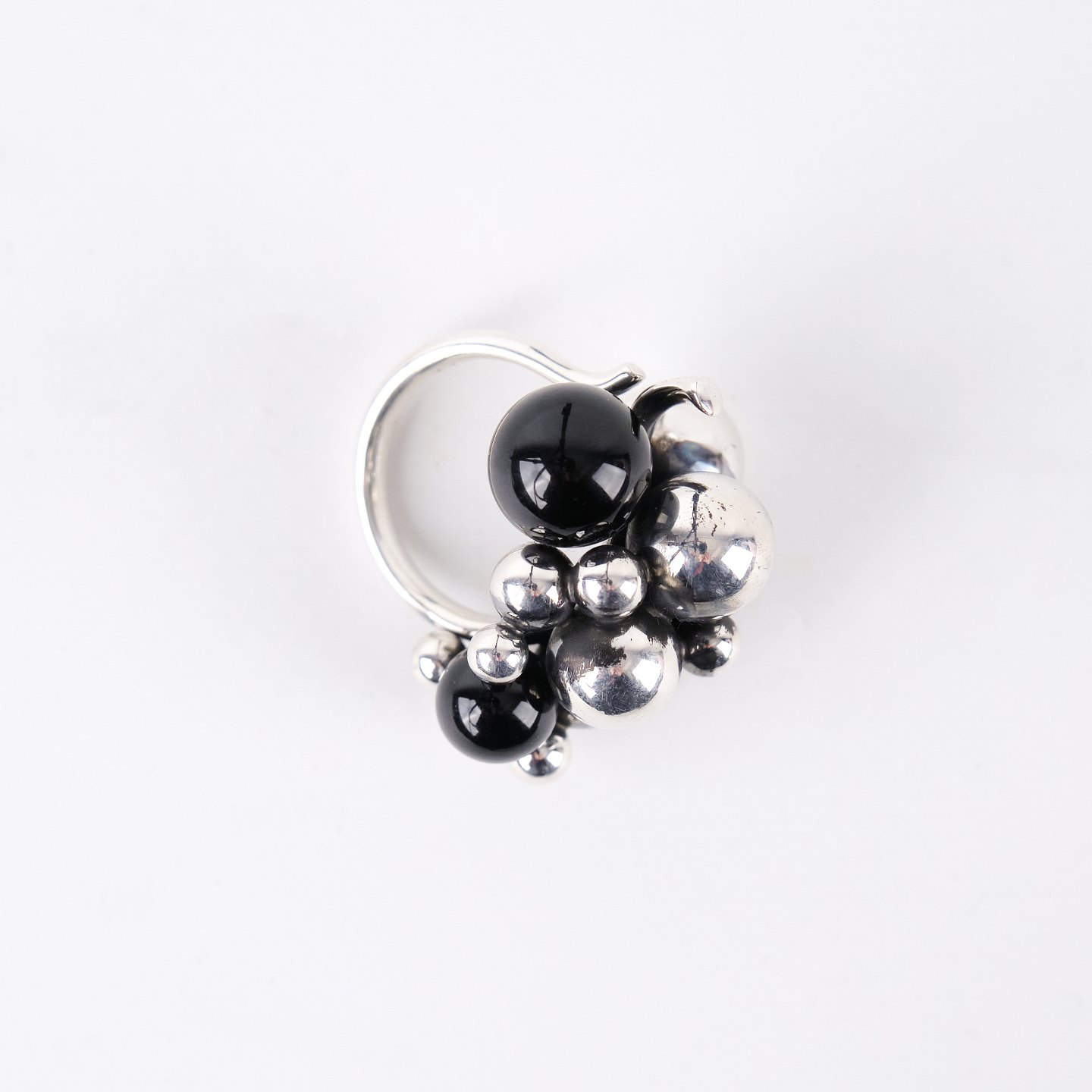 Georg Jensen ring i sterling sølv, model 54 fra Moonlight Grapes-kollektionen. Ringen har det karakteristiske drueornament, som måler 3 × 2,5 cm, og fremstår som et klassisk eksempel på Georg Jensens organiske formsprog. Elegant smykke udført i høj kvalitet.