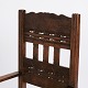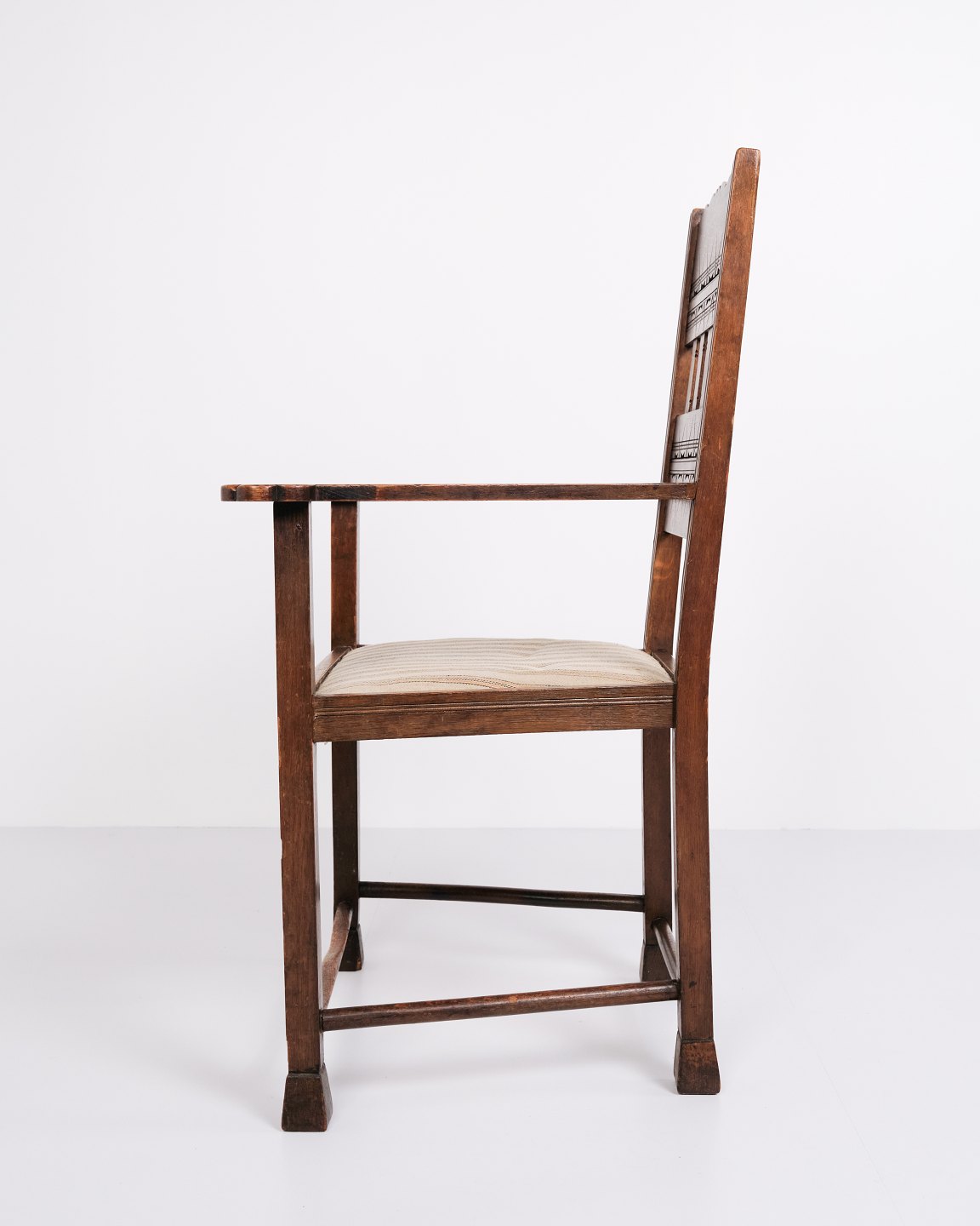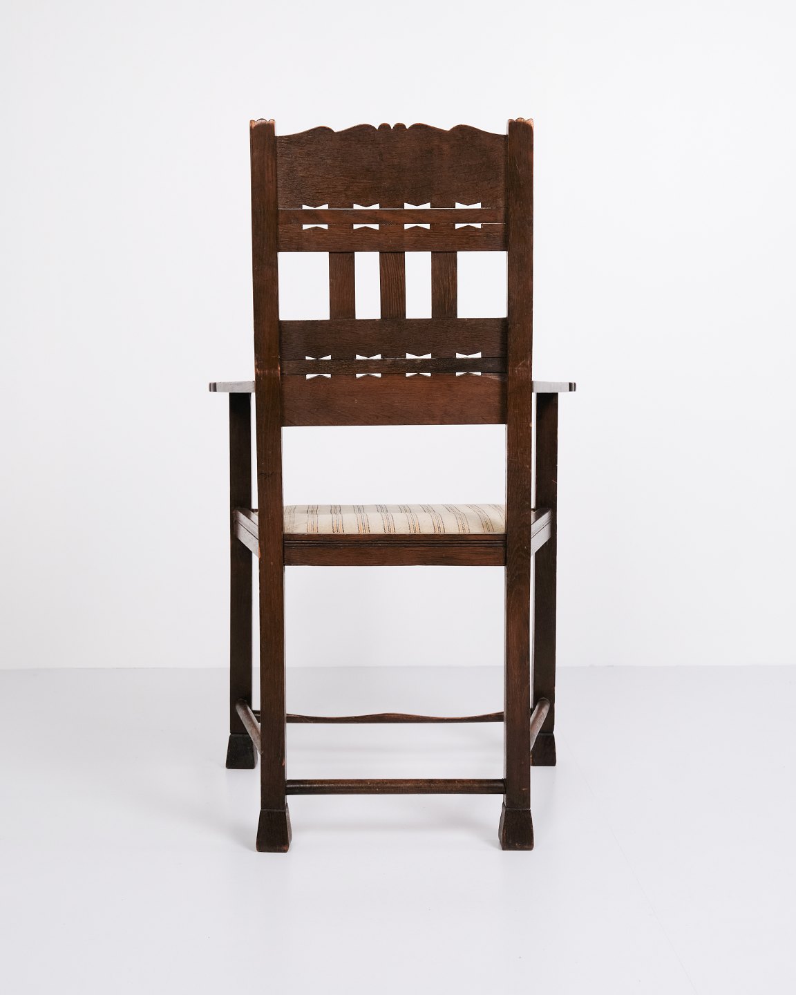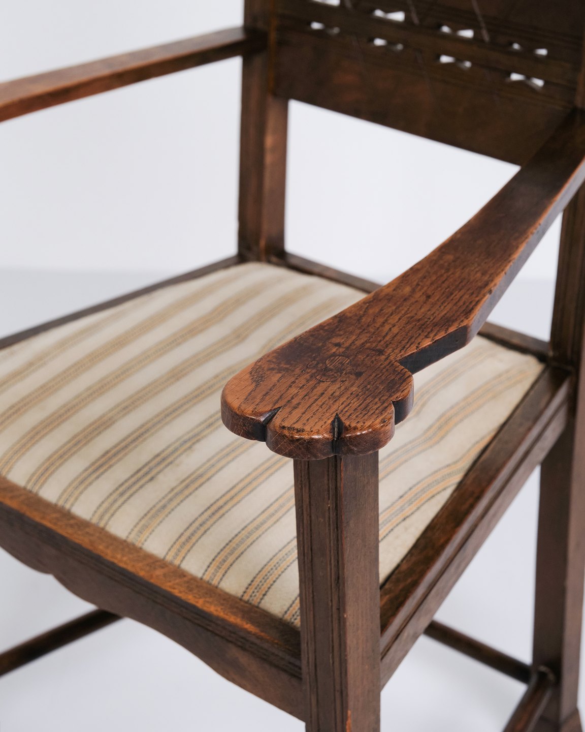 Antik armstol i egetræ fra 1930’erne med stribet polstring.