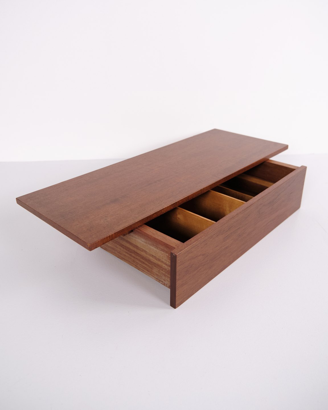 Wall-mounted shelf from the 1960s, made of teak with a spacious drawer integrated into the front.