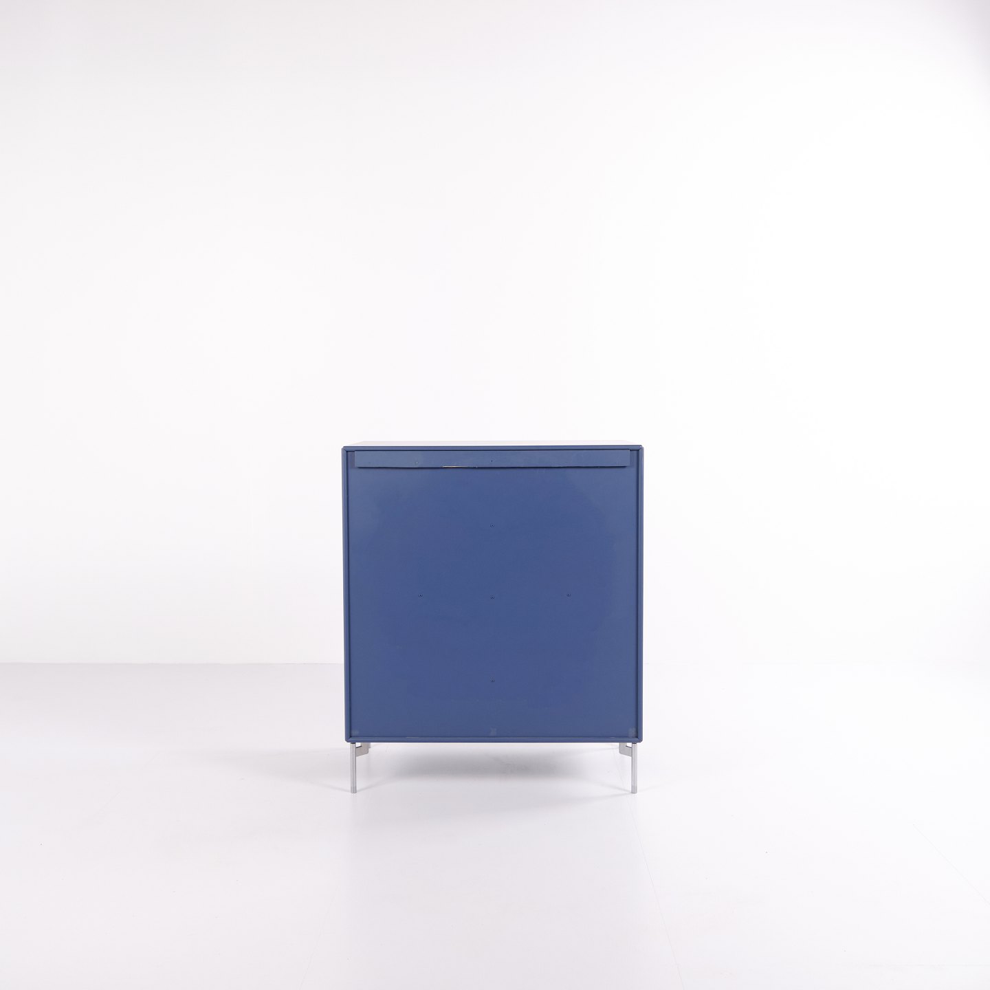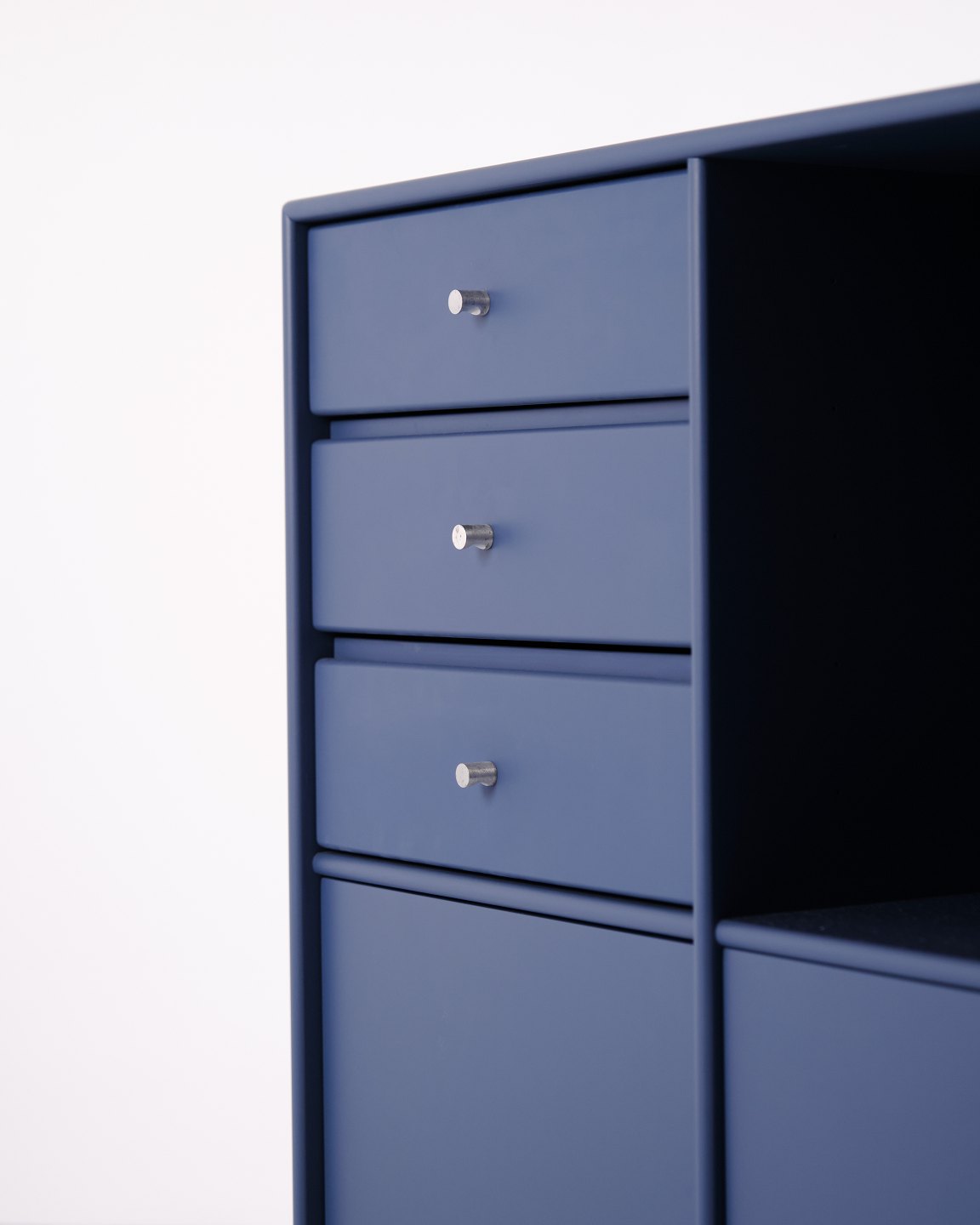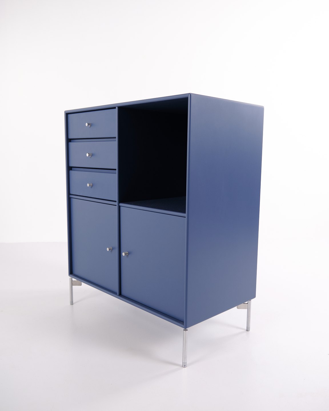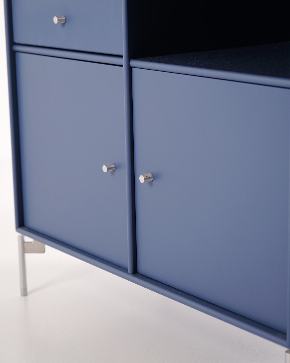 Montana kommode i blå med krom ben. Modulet er indrettet med tre skuffer og to låger, hvilket giver god og fleksibel opbevaringsplads. Klassisk Montana-design med enkel struktur og høj funktionalitet.