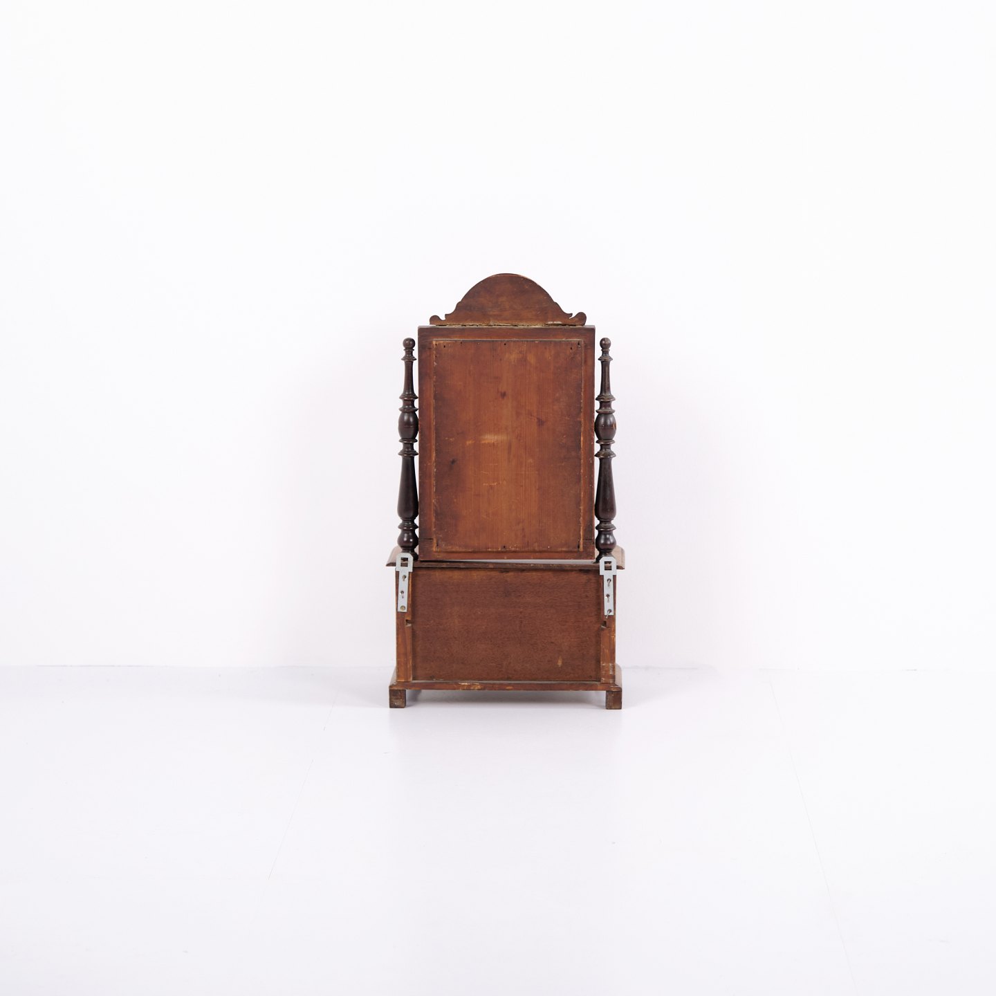Lille barnemøbel fra ca. 1860, udført i mahogni med spejl og to skuffer. Et dekorativt og sjældent antikt møbel med fine detaljer, velegnet som samlerobjekt eller til klassisk indretning.