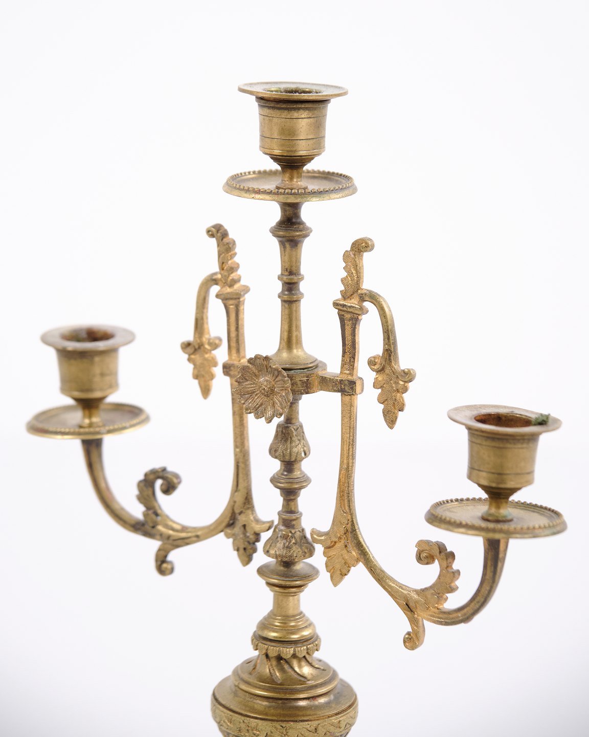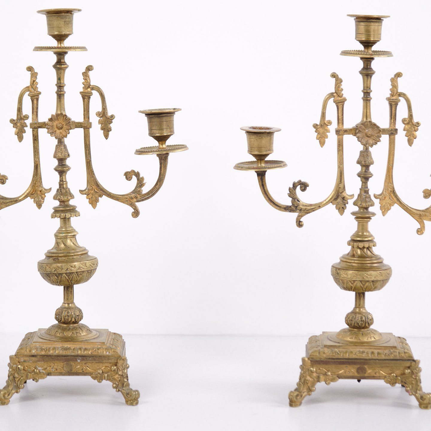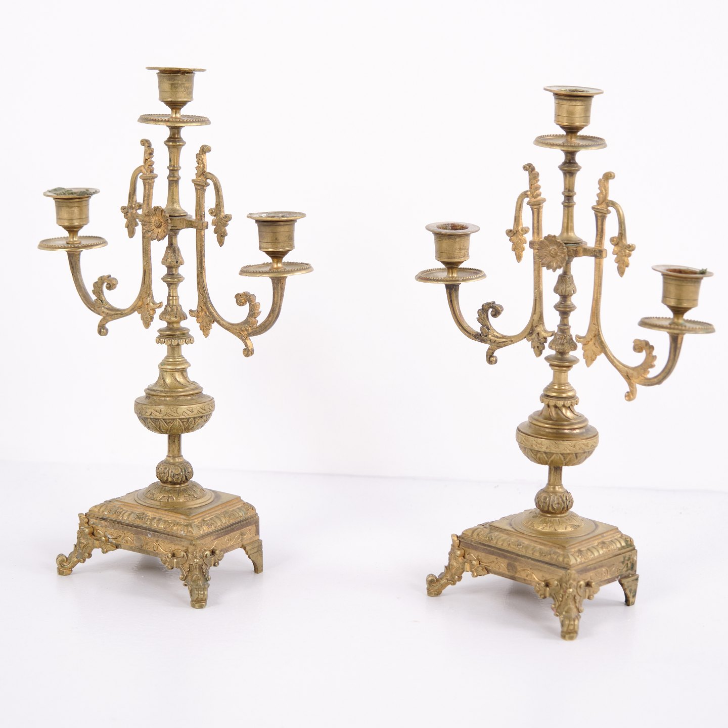 Sæt franske bronze stager fra 1890’erne. Trearmede lysestager med rige udsmykninger og fine detaljer.