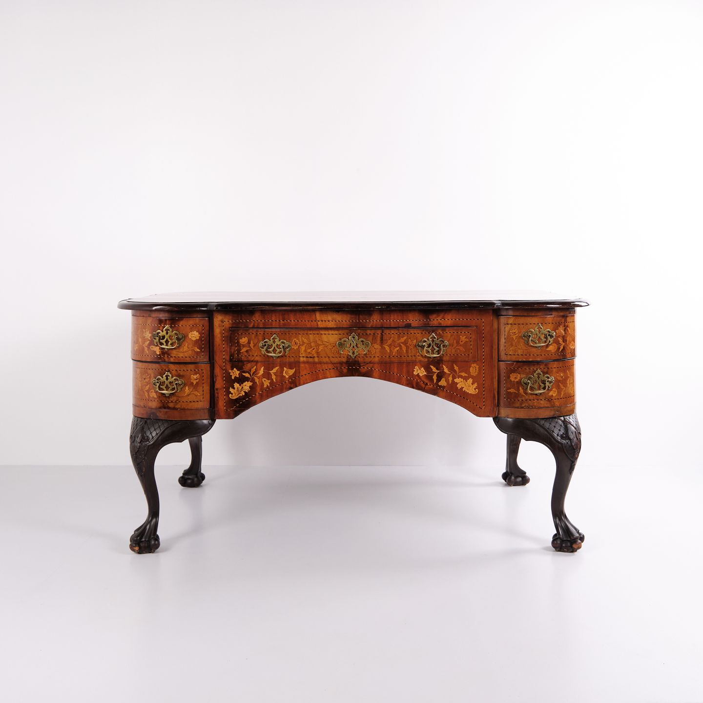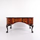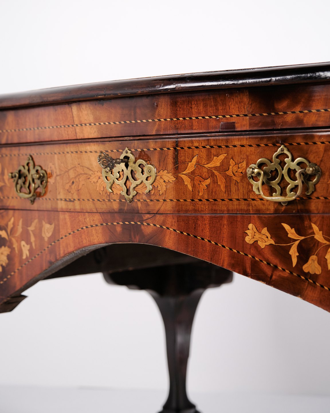 Skrivebord fra ca. 1860, udført i nøddetræ med detaljeret frugttræ-intarsia på både top og sider. Bordet er håndpoleret med shellak, hvilket giver en dyb glød og fremhæver det fine håndværk. Et elegant antikt møbel med rige dekorationer og solide materialer.