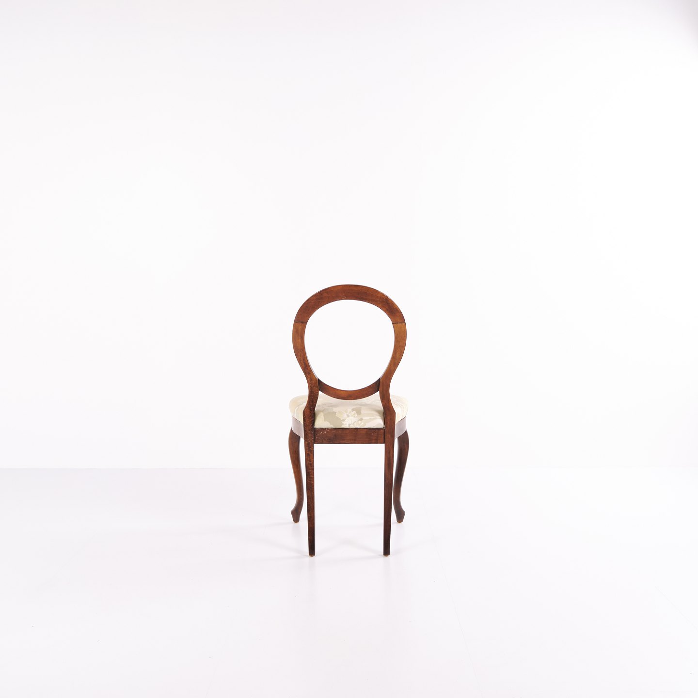 Set of four salon/dining chairs from the 1860s, made of mahogany and upholstered in light floral fabric. Rococo-inspired design with carved details and classic proportions. Elegant chairs for dining rooms, living spaces or hallways.