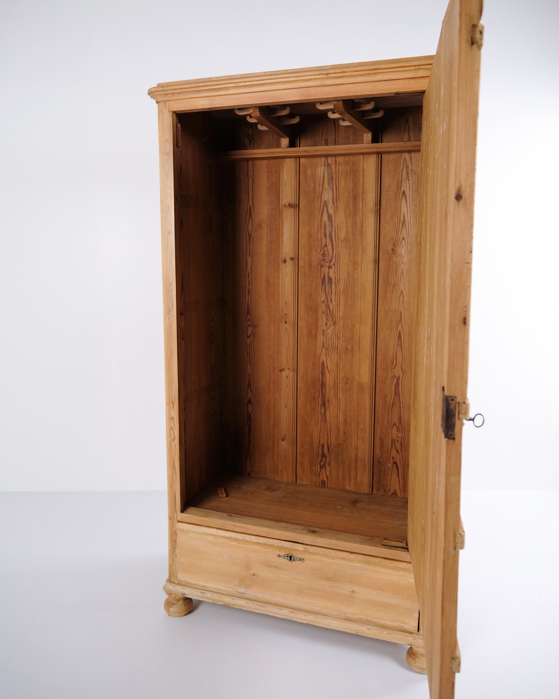 Karlekammerskab fra begyndelsen af 1900-tallet, udført i fyrretræ med et enkelt, klassisk formsprog. Skabet står på runde ben og har en frontlåge samt en praktisk skuffe nederst, hvilket giver opbevaringsplads.