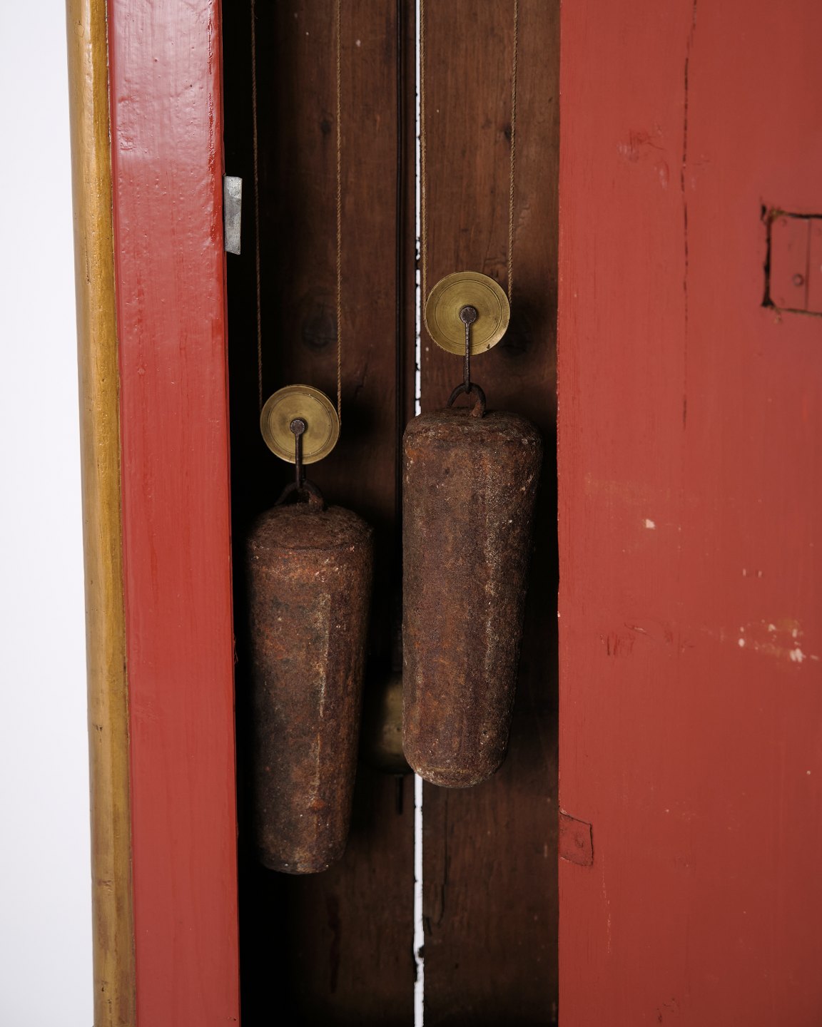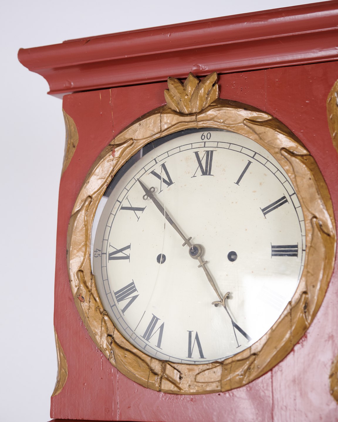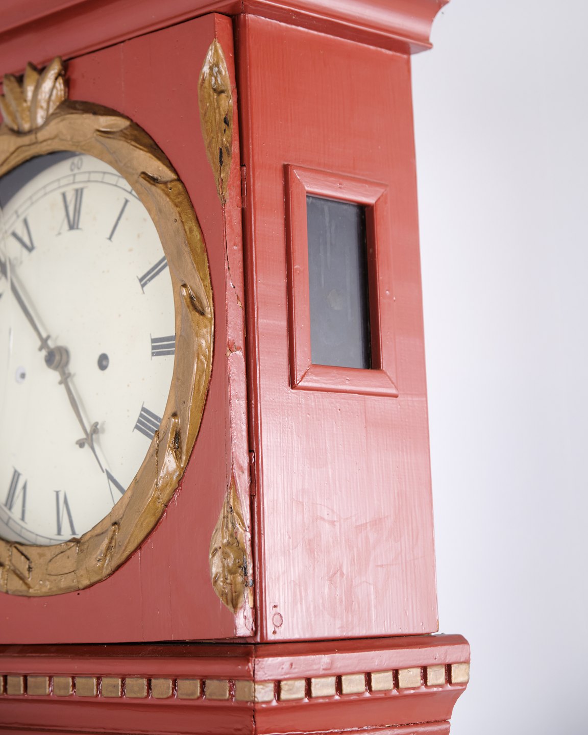 Bornholmerur fra ca. 1820’erne, rødbemalet med dekorative udskæringer og klassisk formsprog fra perioden. Et originalt standerur med karakter og tidsrigtige detaljer.
