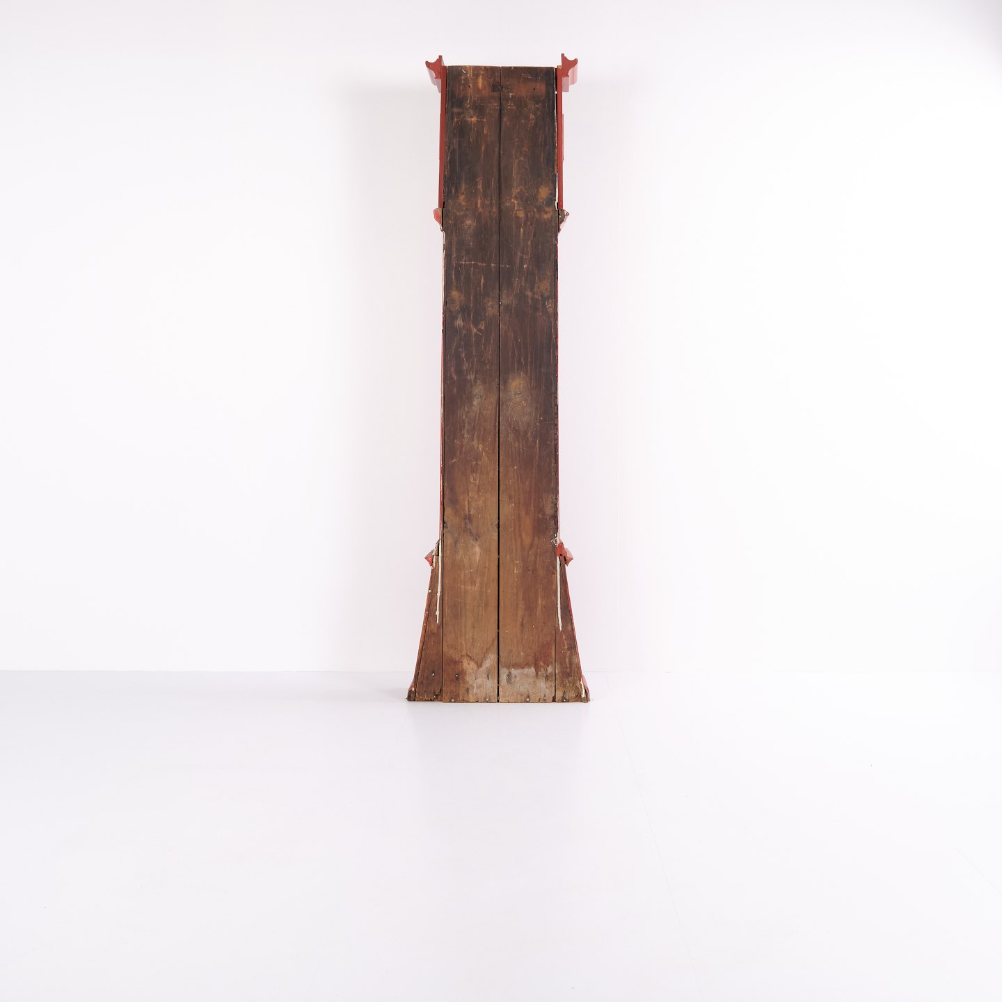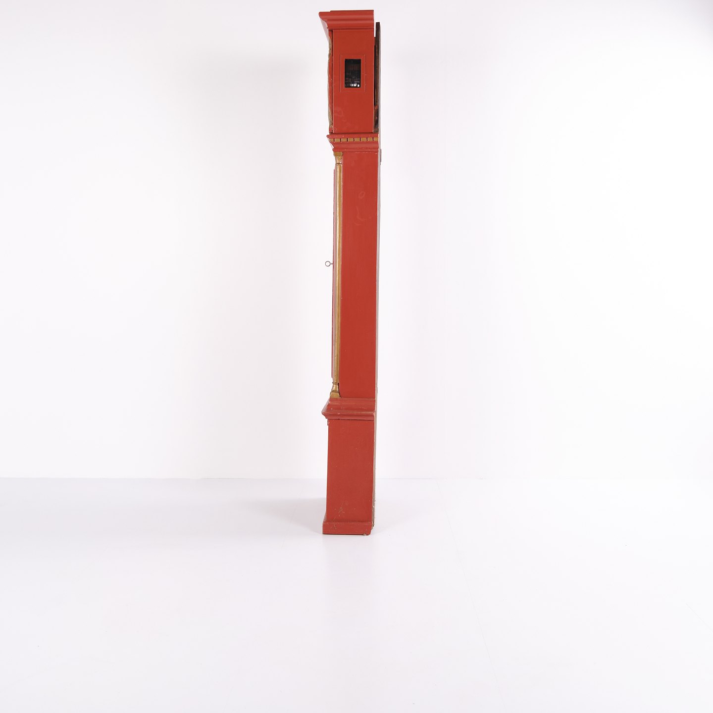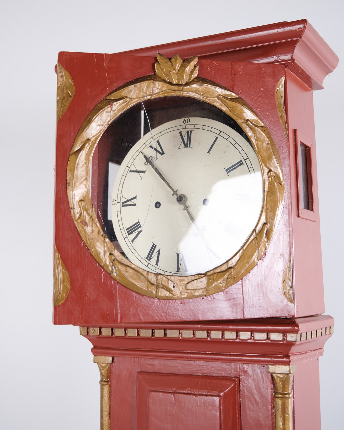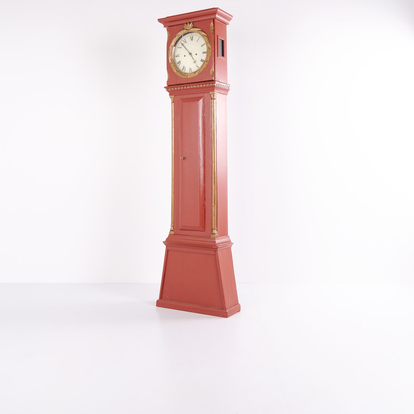 Bornholmerur fra ca. 1820’erne, rødbemalet med dekorative udskæringer og klassisk formsprog fra perioden. Et originalt standerur med karakter og tidsrigtige detaljer.