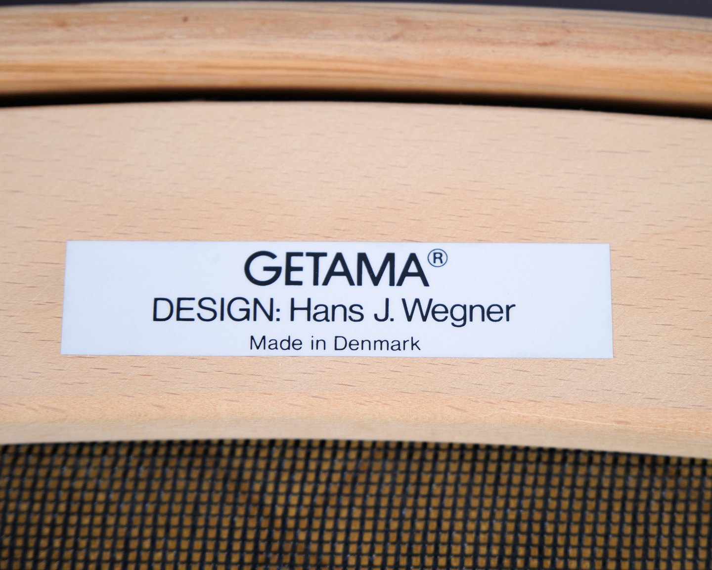 Lounge chair model GE 284 designed by Hans J. Wegner and produced by Getama. Made with a solid oak frame and loose cushions upholstered in blue wool. A classic Wegner design offering comfort and a compact form suitable for both modern and traditional interiors.