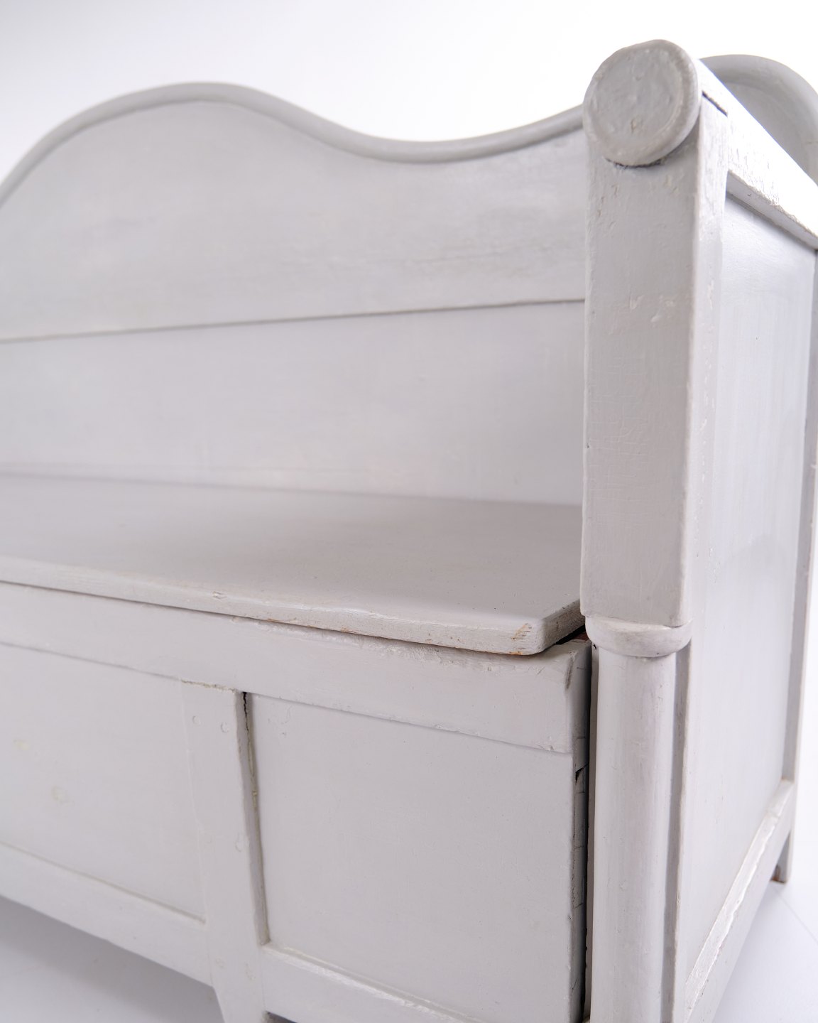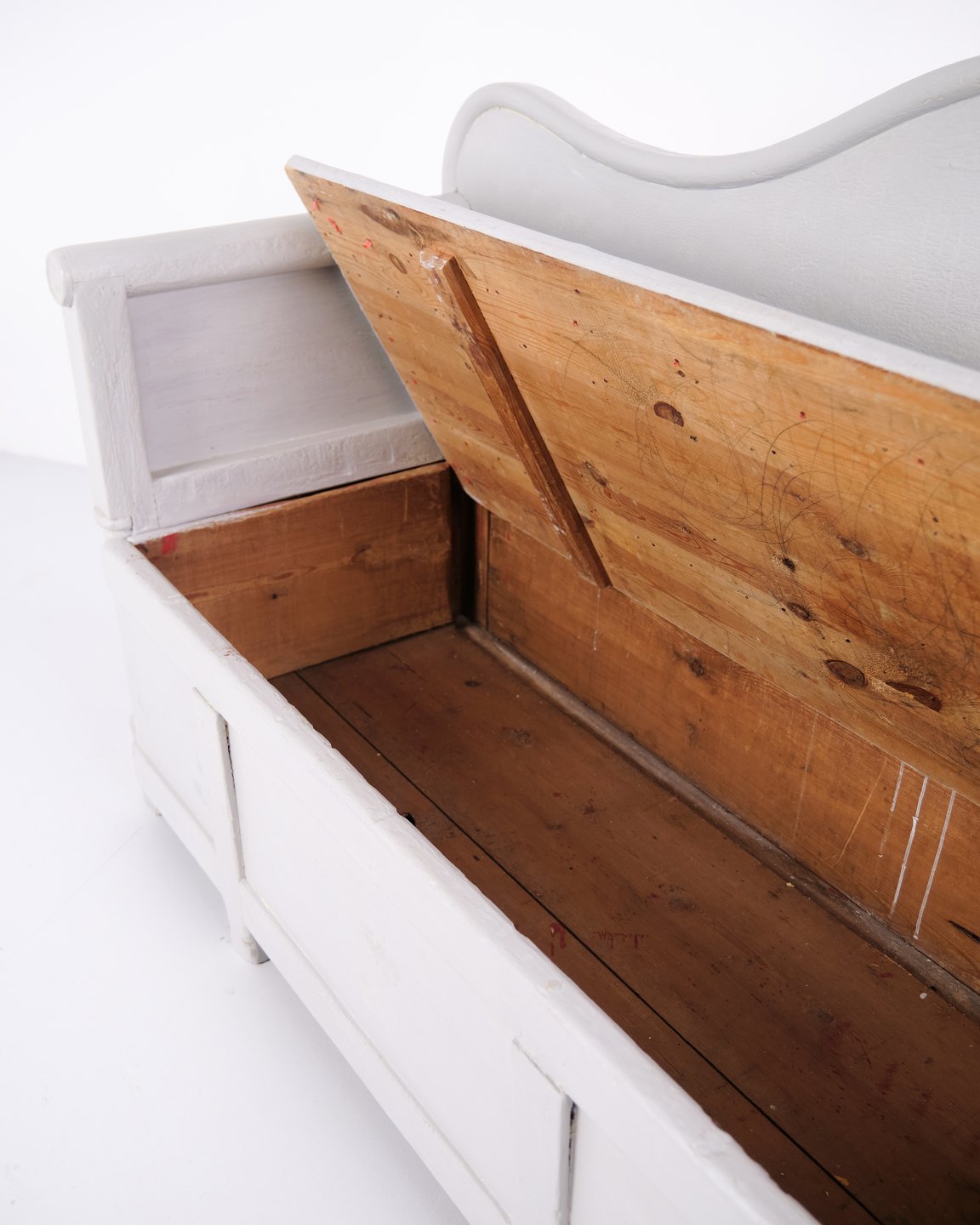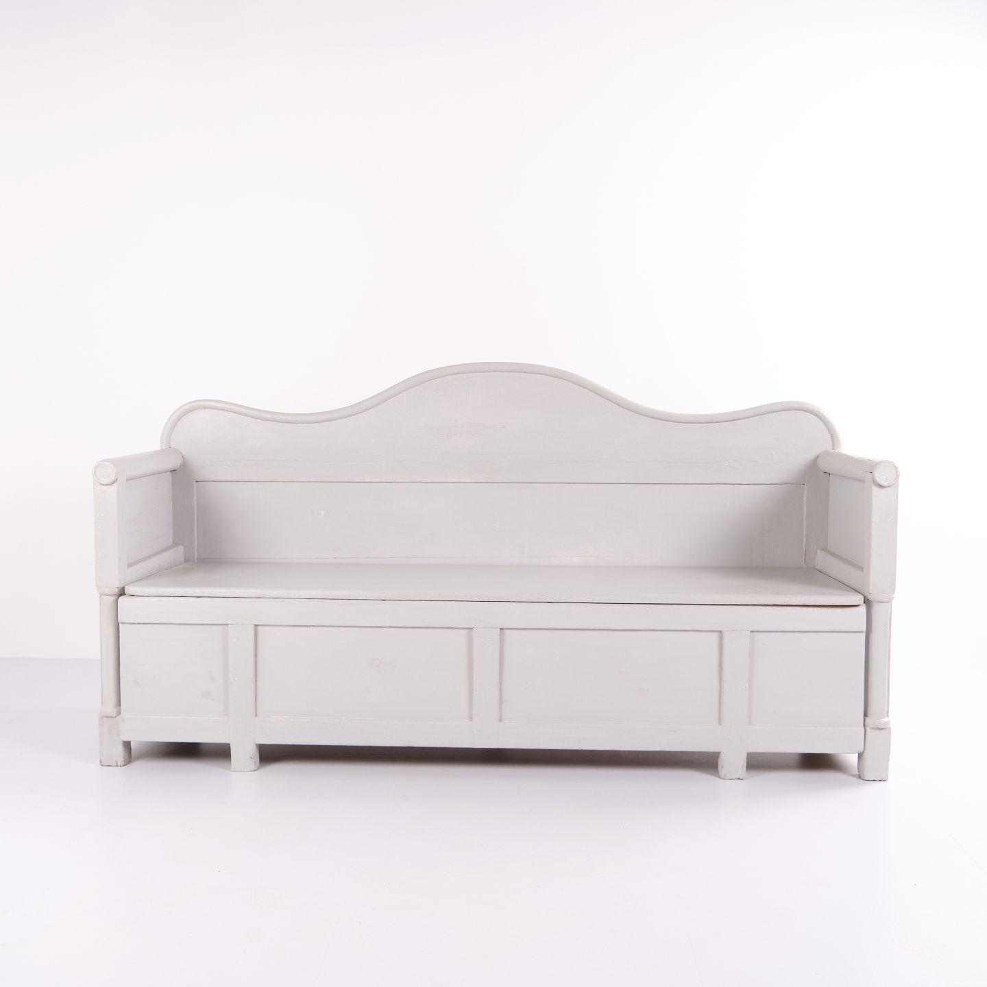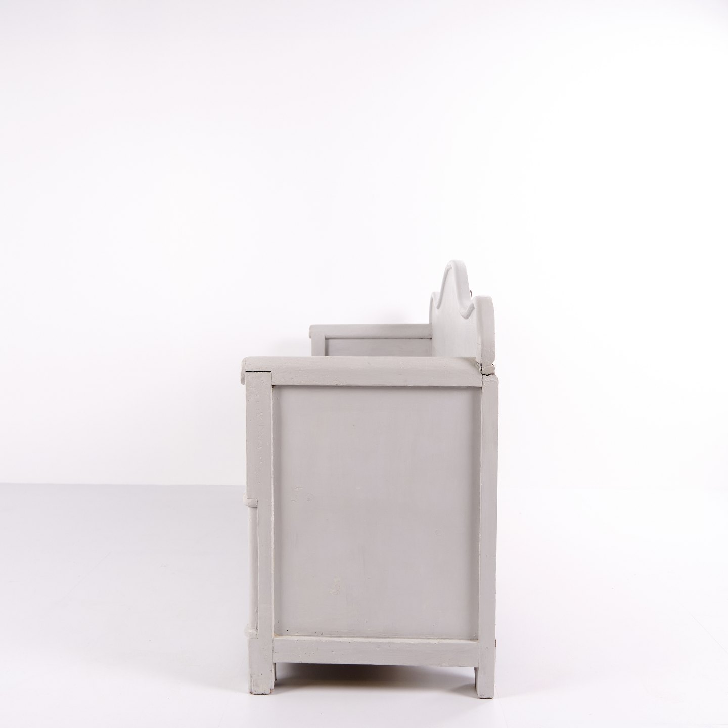 Antique Swedish bench from the 20th century, made in pine and painted grey. Classic Scandinavian design with storage space under the seat and characteristic period details. A solid piece suitable for hallway, kitchen or living room.