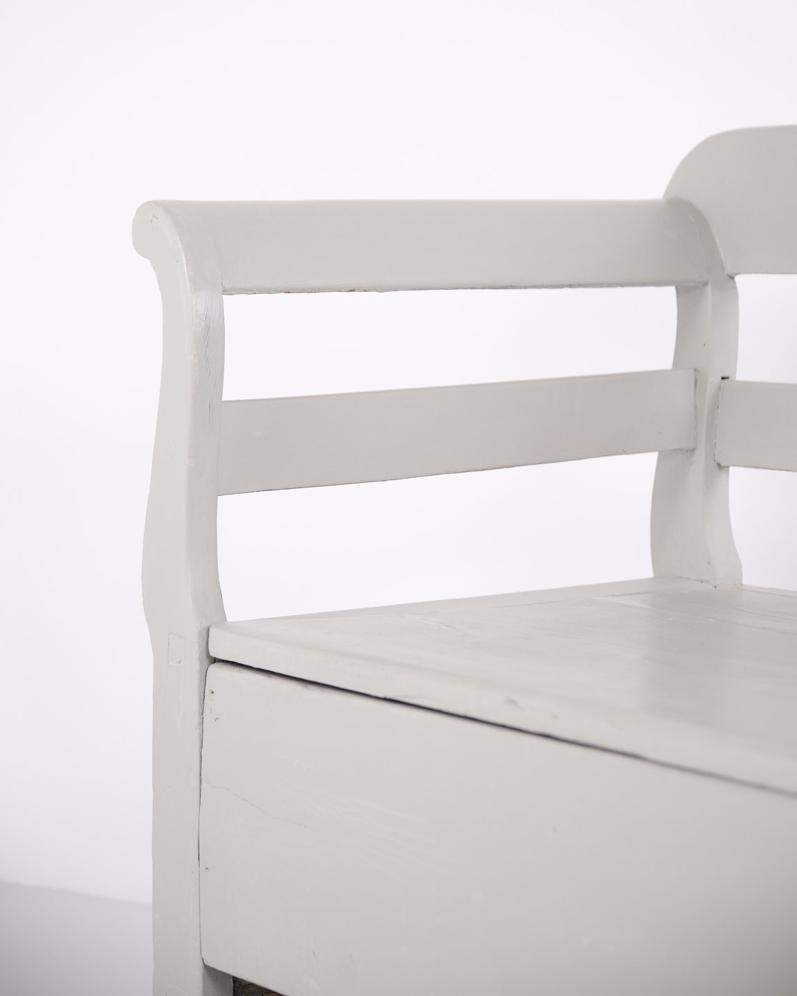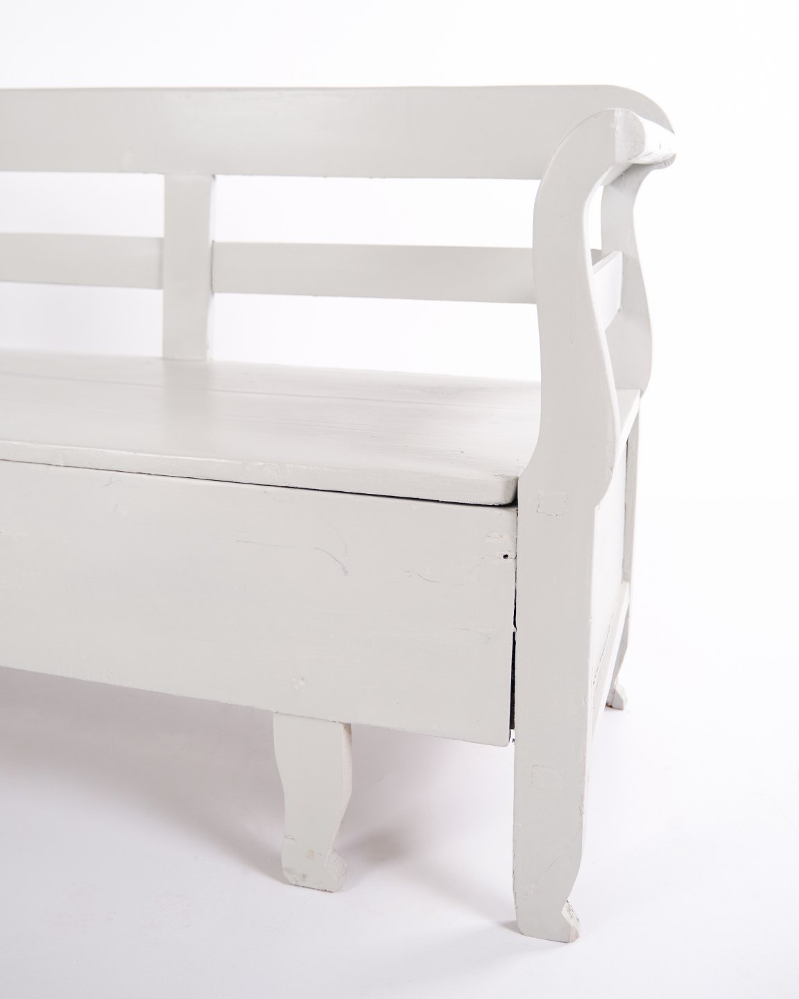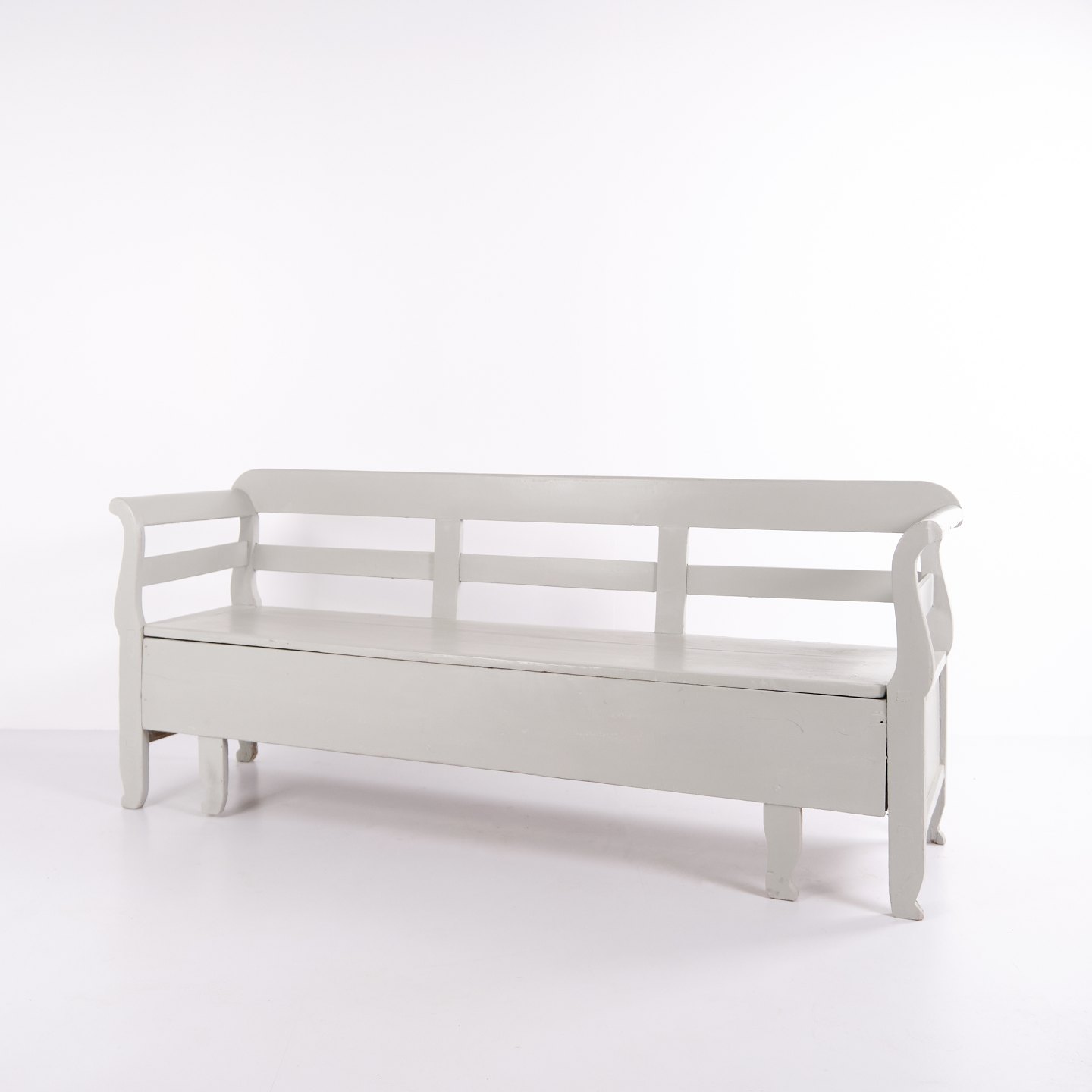 Antik slagbænk fra 1860’erne i gråmalet fyrretræ med opbevaring. Klassisk og funktionelt møbel med patina.