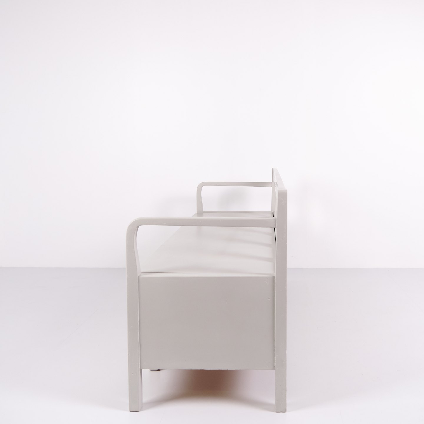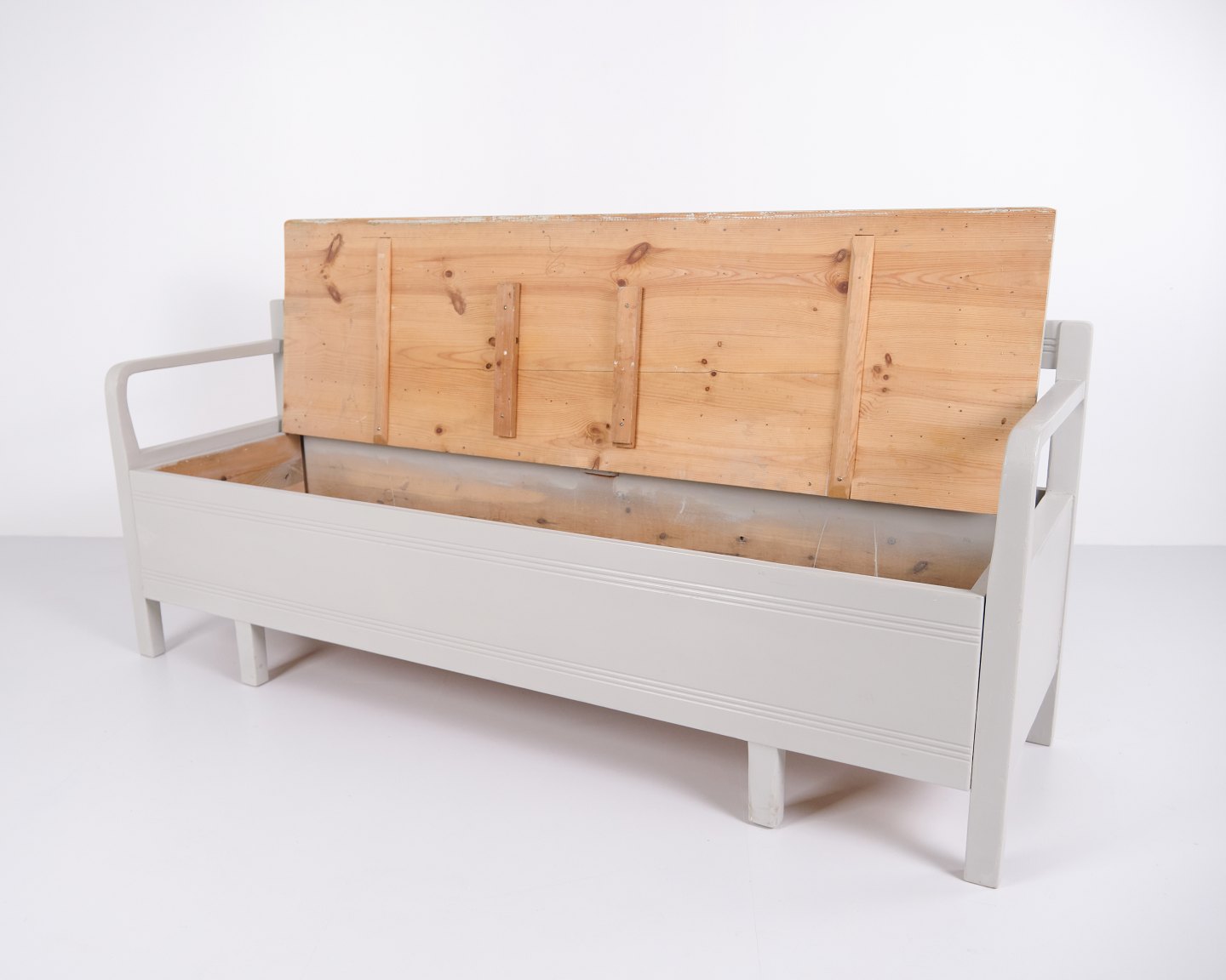 Antik slagbænk fra 1860’erne i gråmalet fyrretræ. Klassisk almuedesign med siddeplads og opbevaring. Historisk og funktionelt møbel.