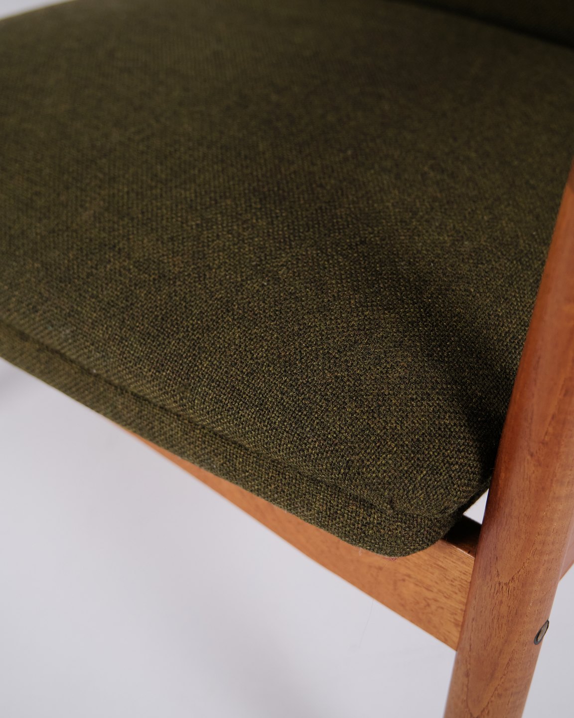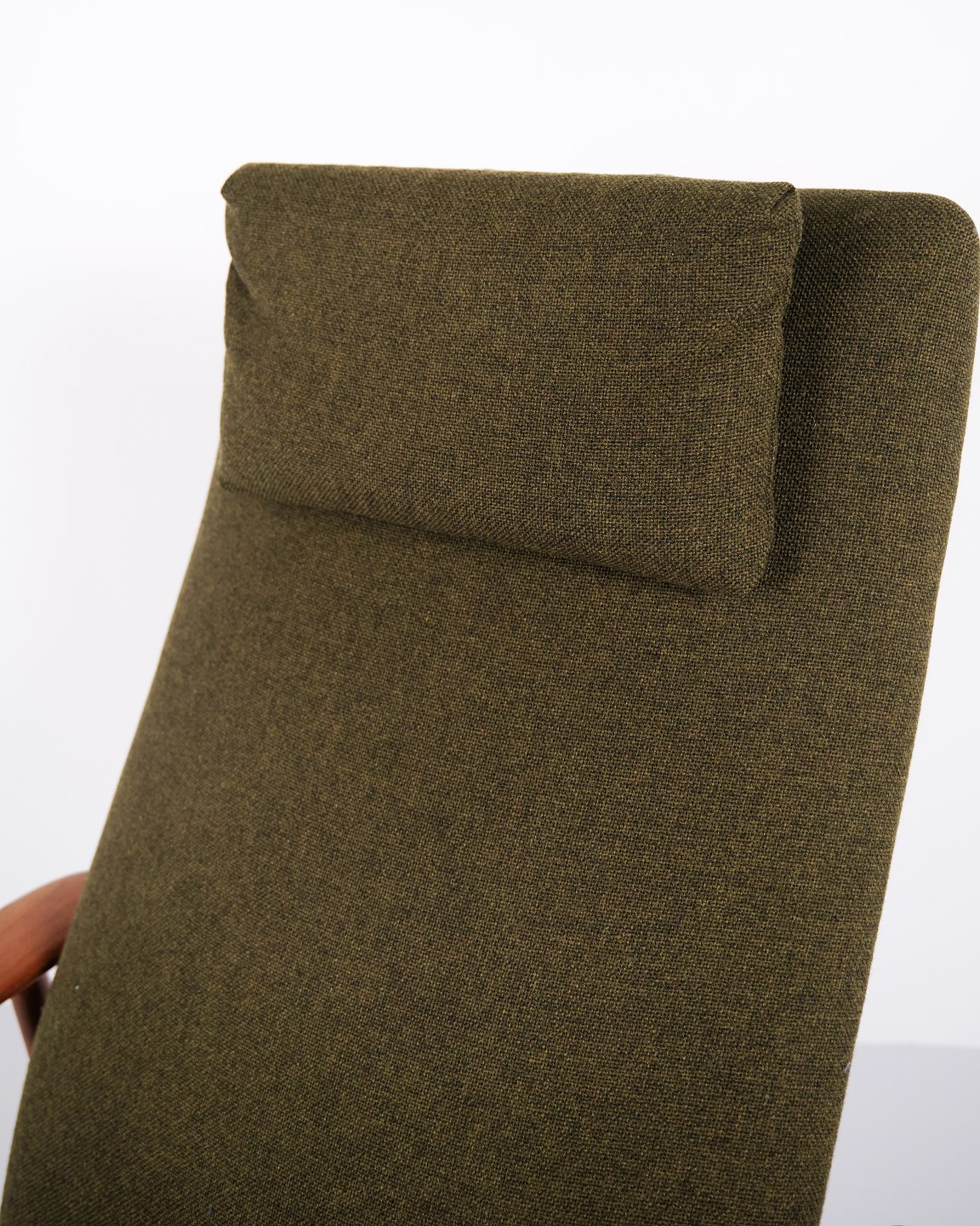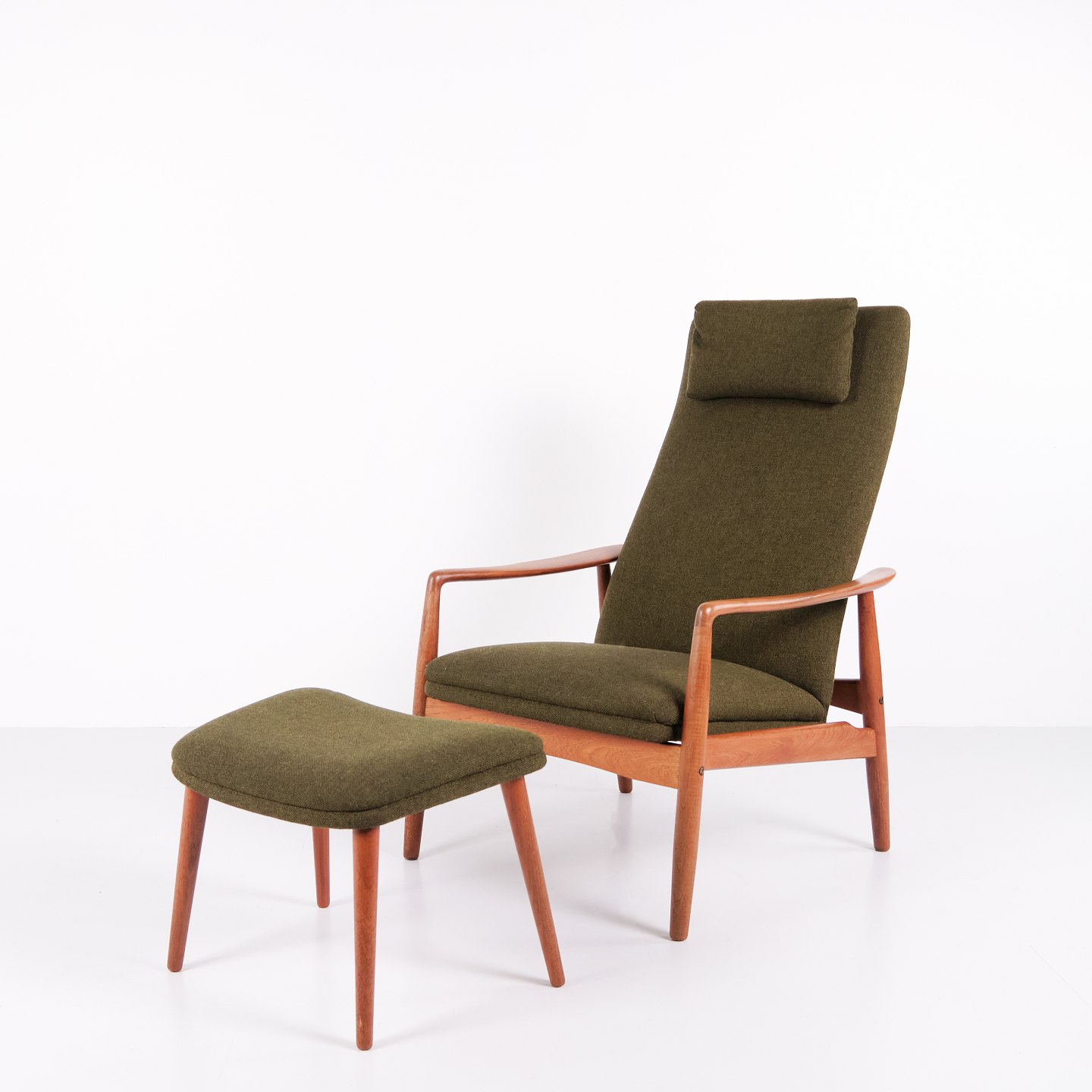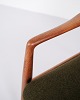 Et par hvilestole med skammel designet af Alf Svensson for Fritz Hansen. Teaktræ og grønt stof. Skandinavisk design fra 1960’erne med fokus på komfort.