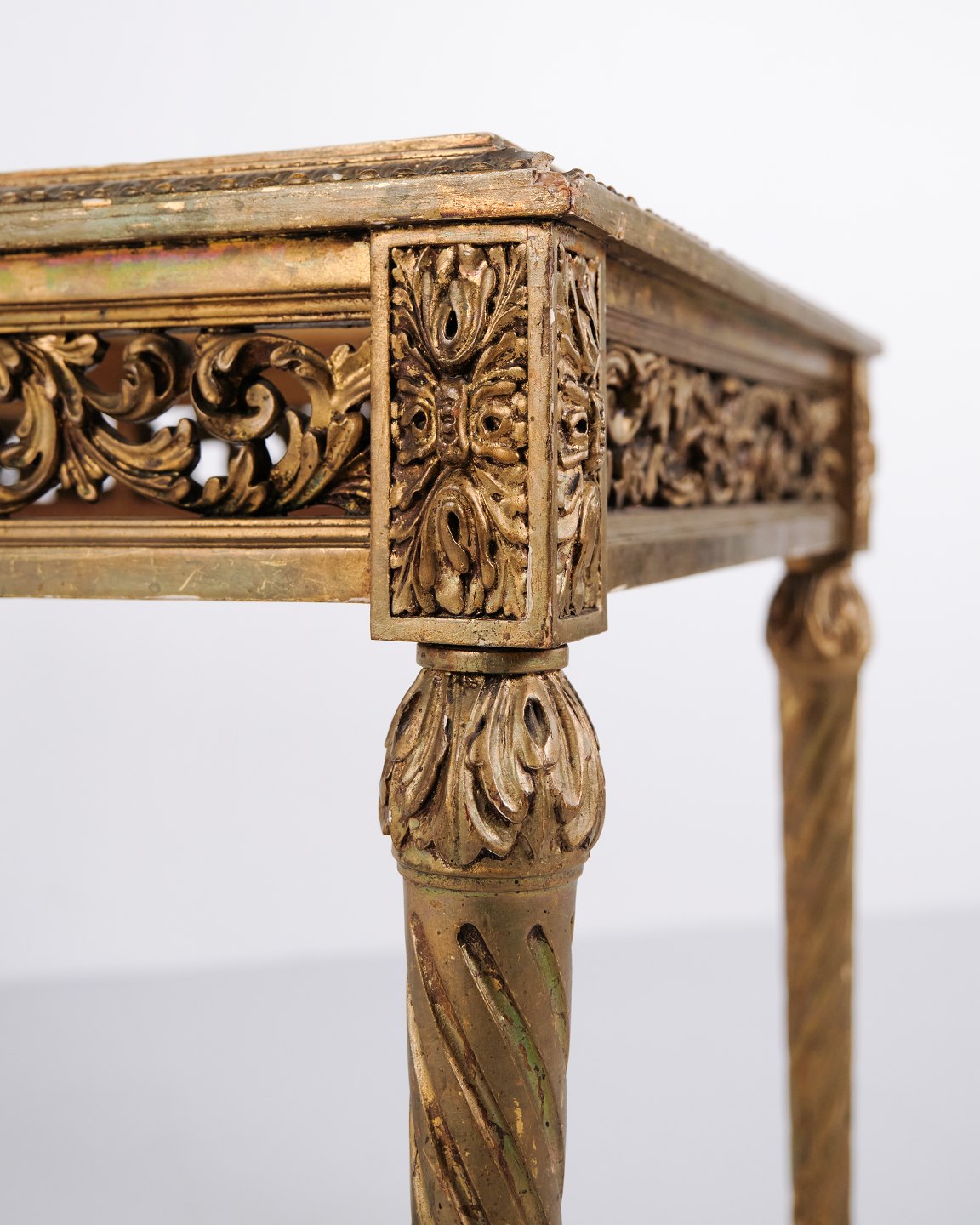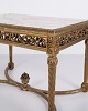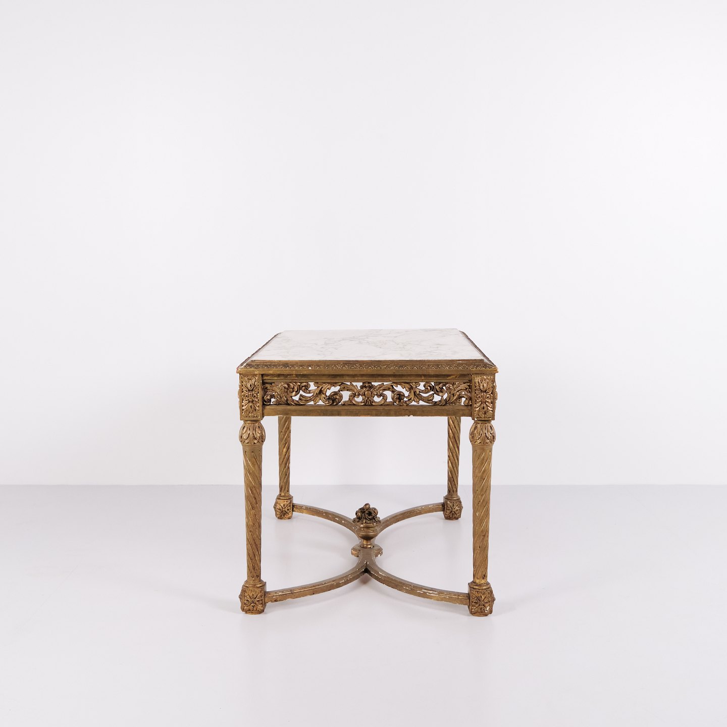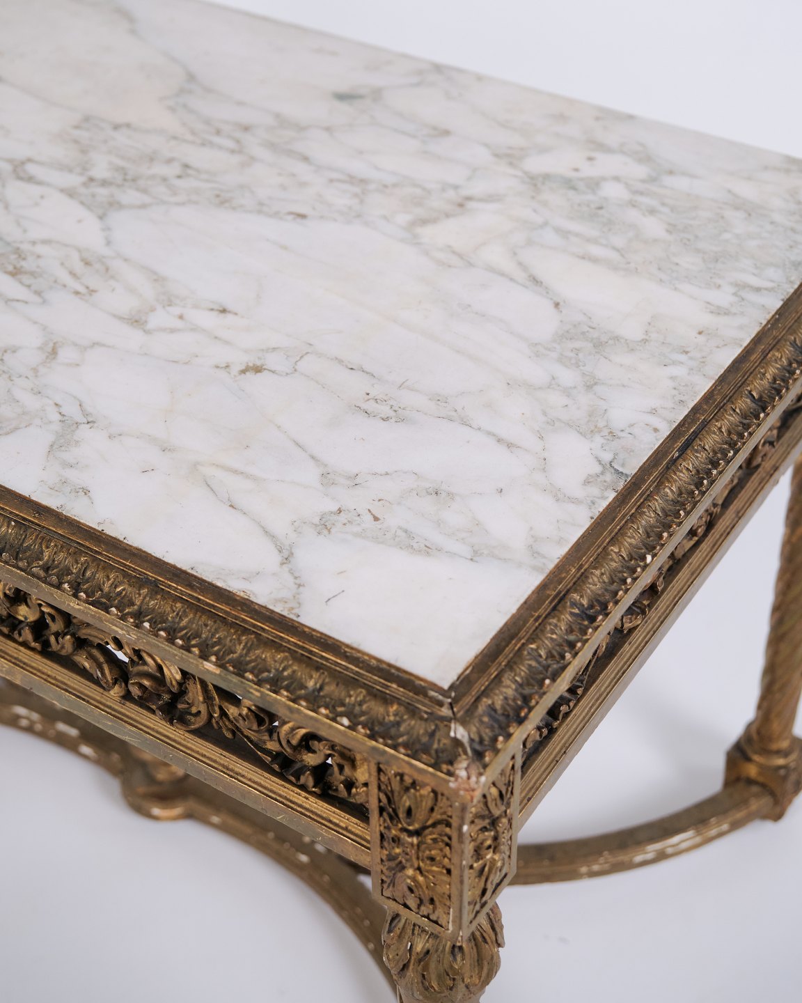 Antikt Louis XVI salonbord fra 1850’erne med marmorplade, forgyldt træ og detaljerede udskæringer. Louis XVI møbelstil 1800-tallet.