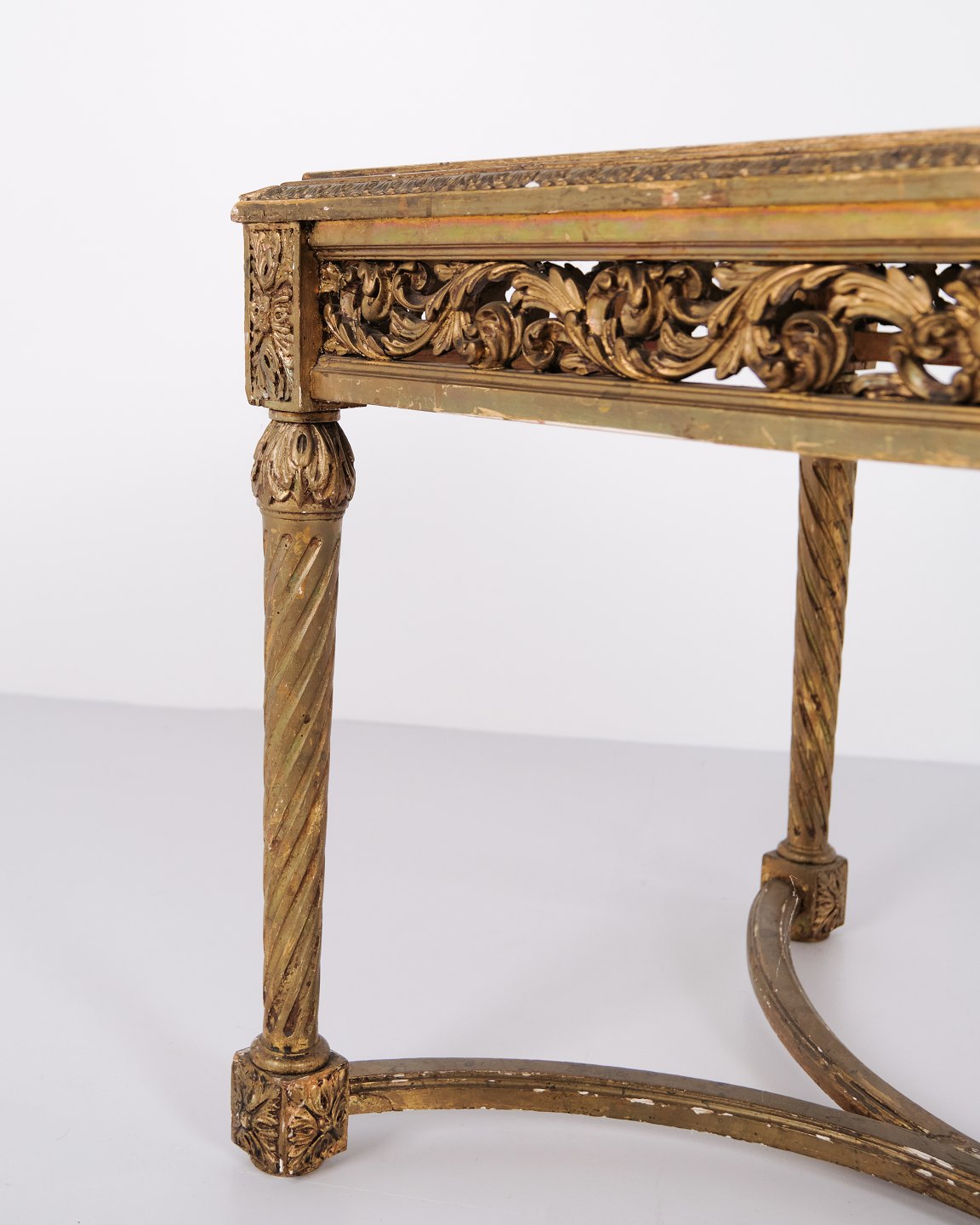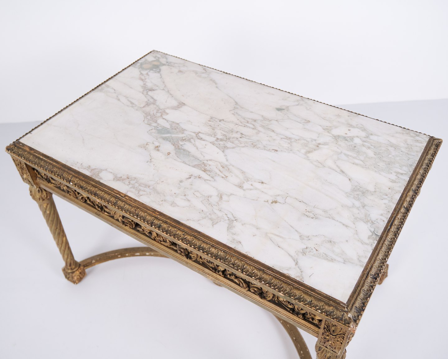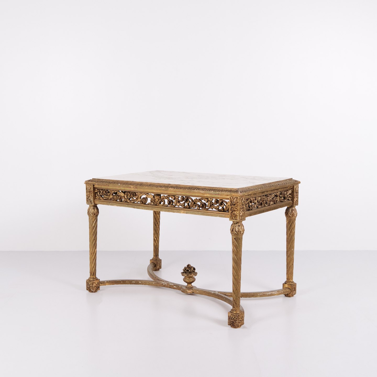 Antikt Louis XVI salonbord fra 1850’erne med marmorplade, forgyldt træ og detaljerede udskæringer. Louis XVI møbelstil 1800-tallet.
