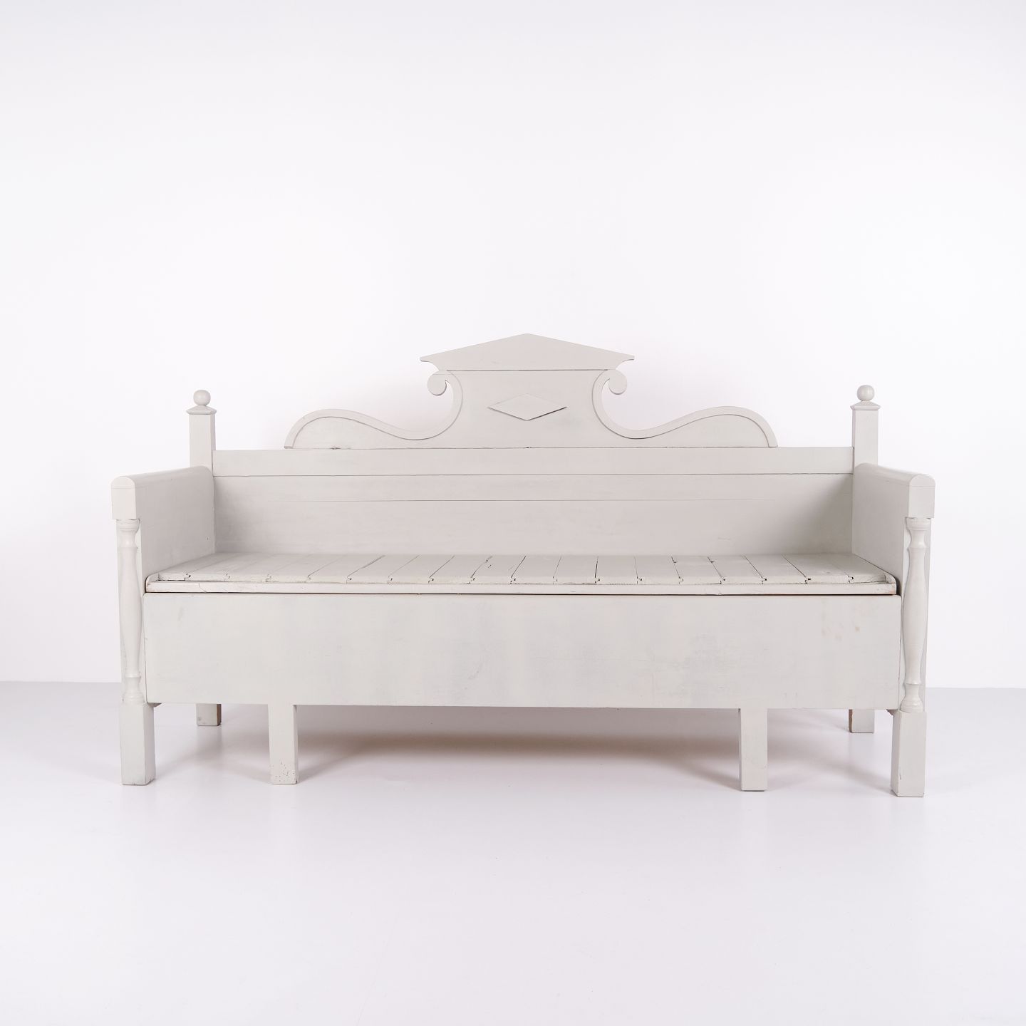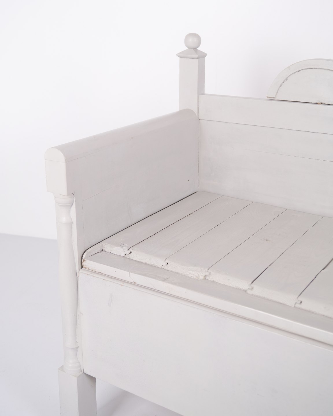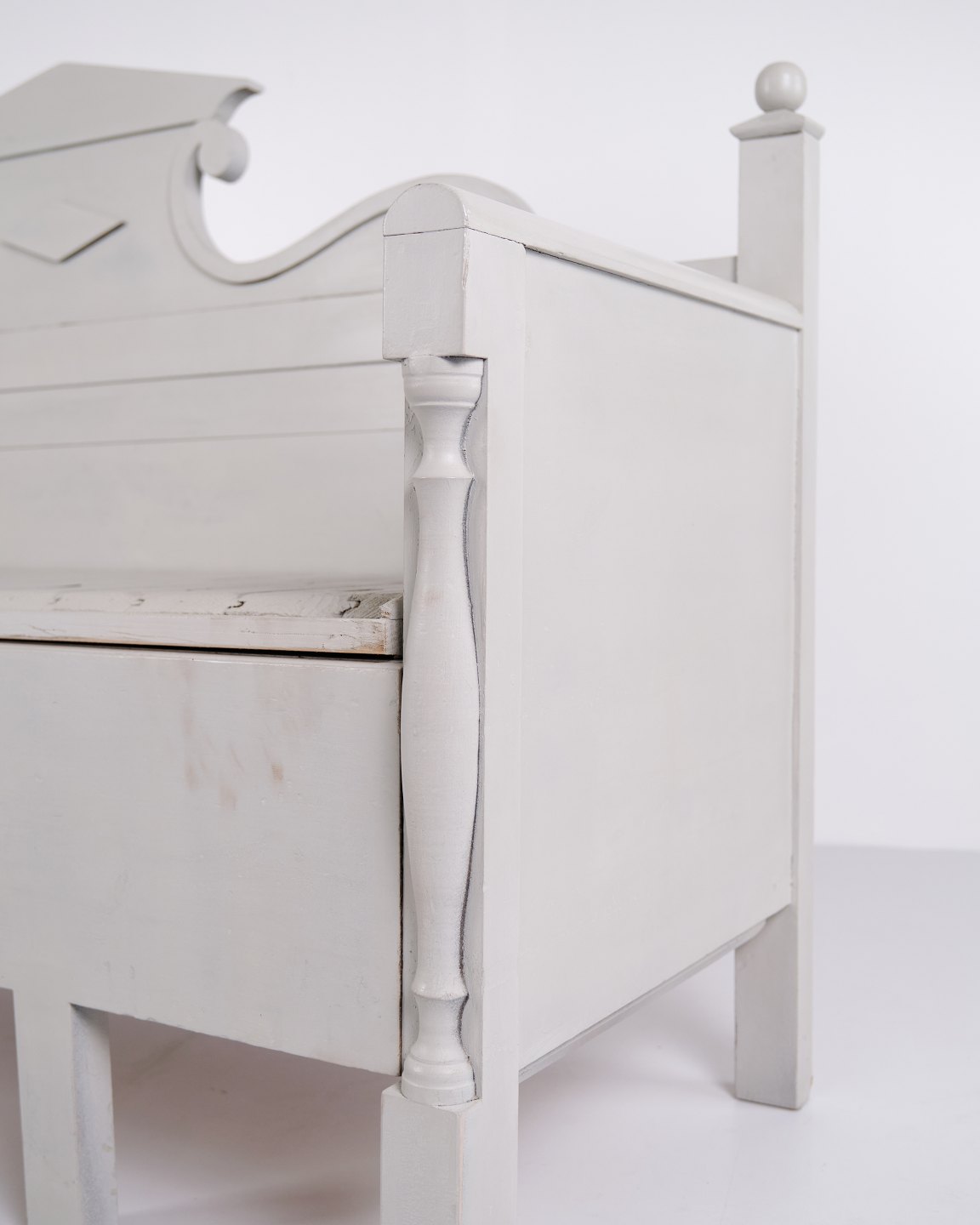Antik slagbænk 1860’erne i gråmalet fyrretræ med udskårne detaljer og opbevaring. Antik opbevaringsbænk 1800-tallet.