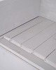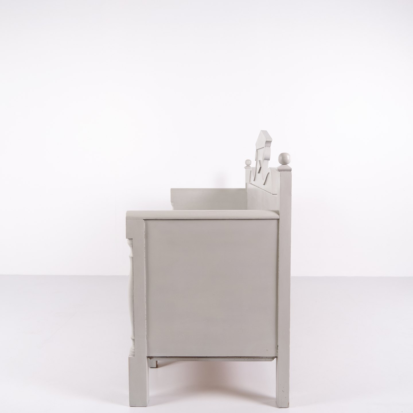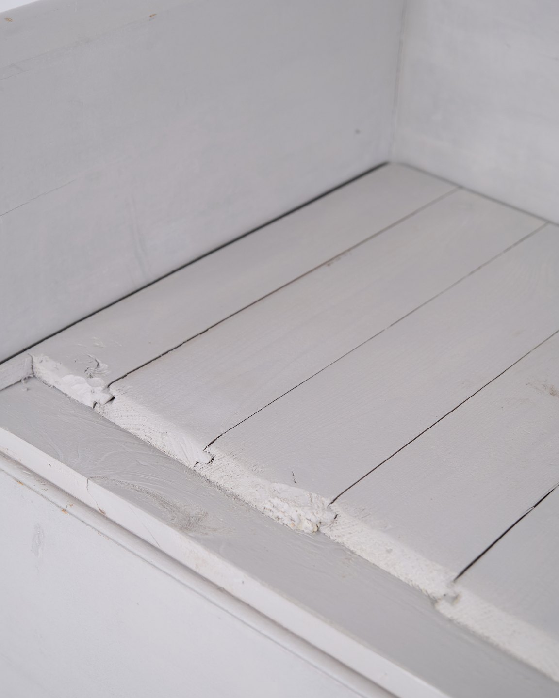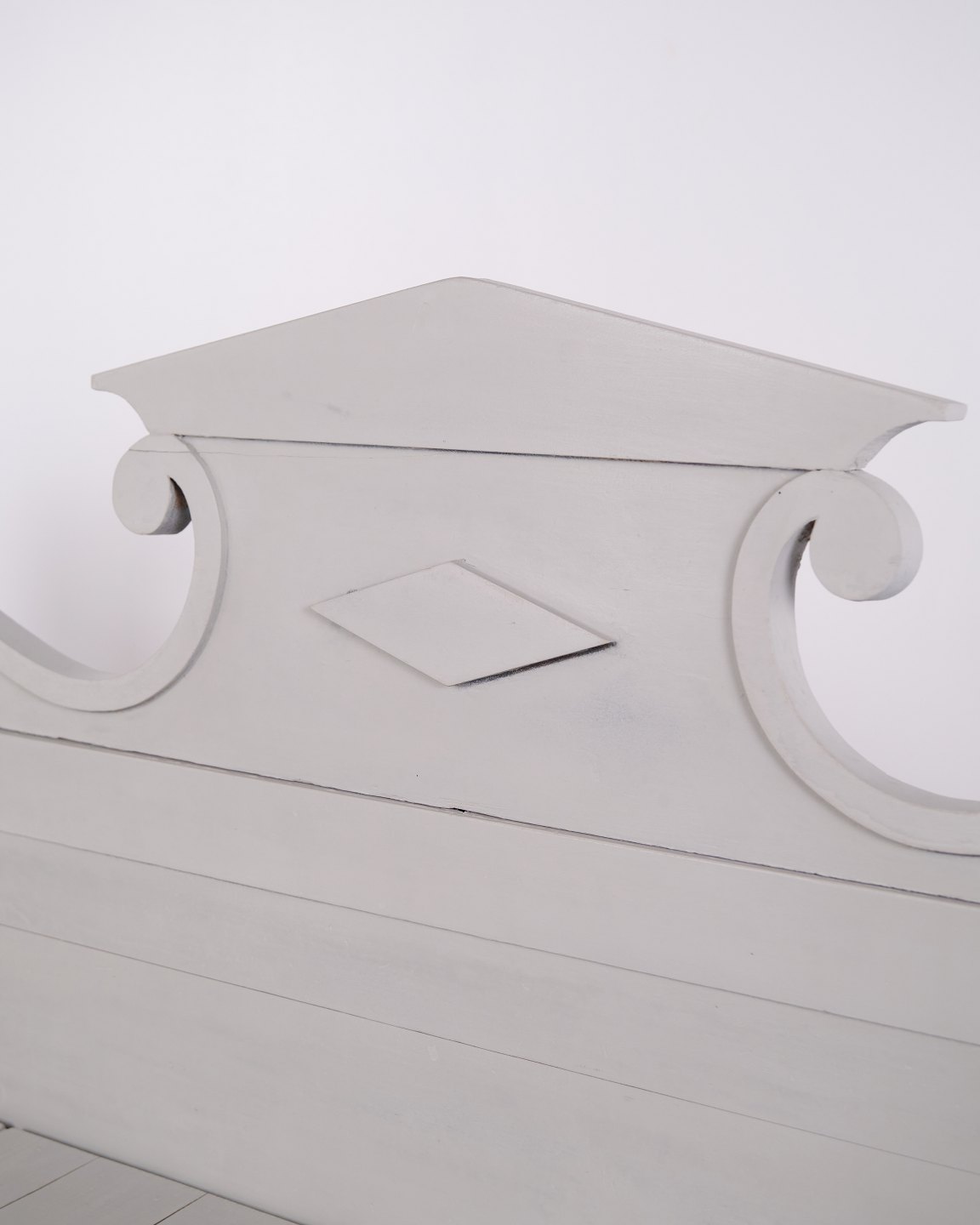 Antik slagbænk 1860’erne i gråmalet fyrretræ med udskårne detaljer og opbevaring. Antik opbevaringsbænk 1800-tallet.
