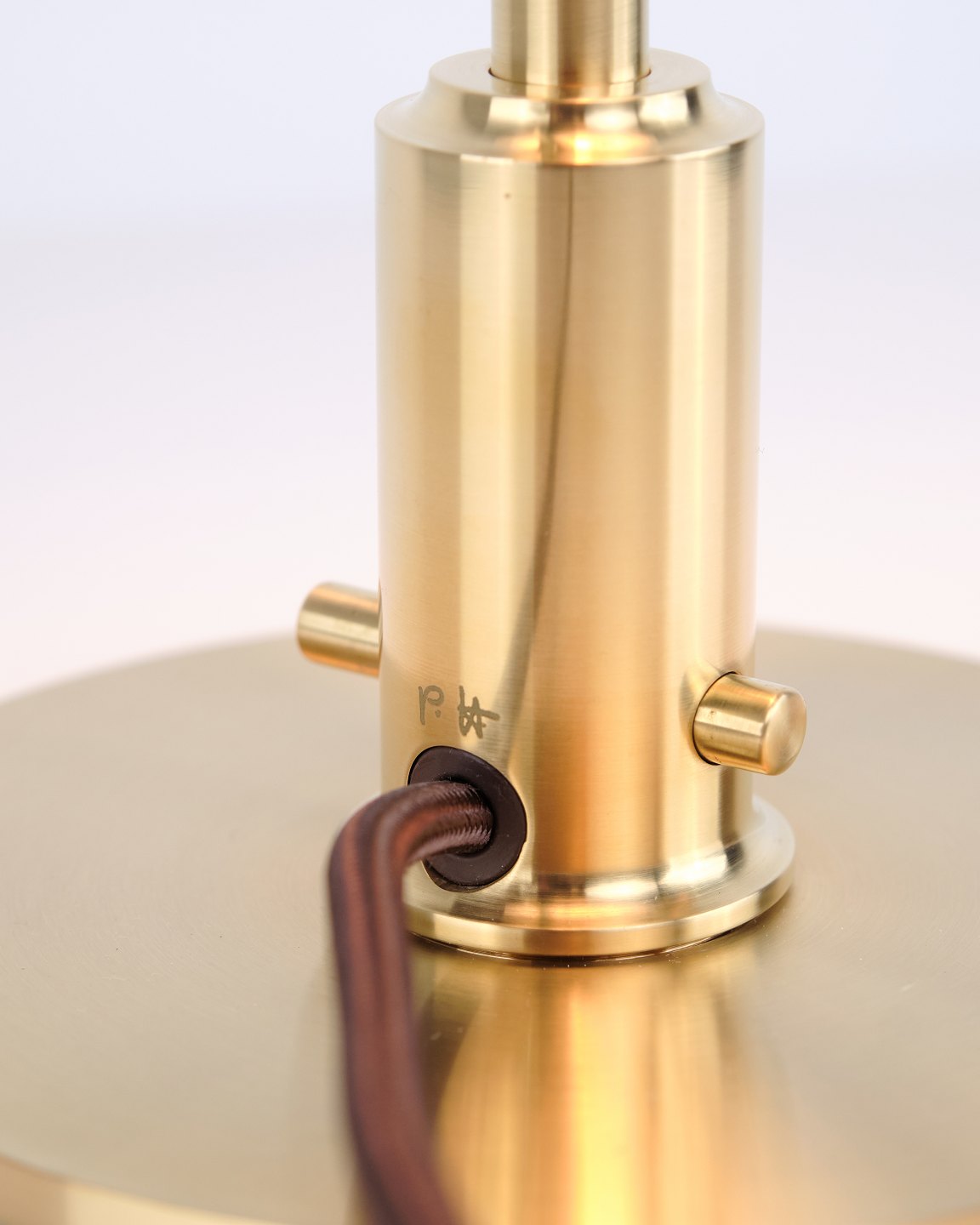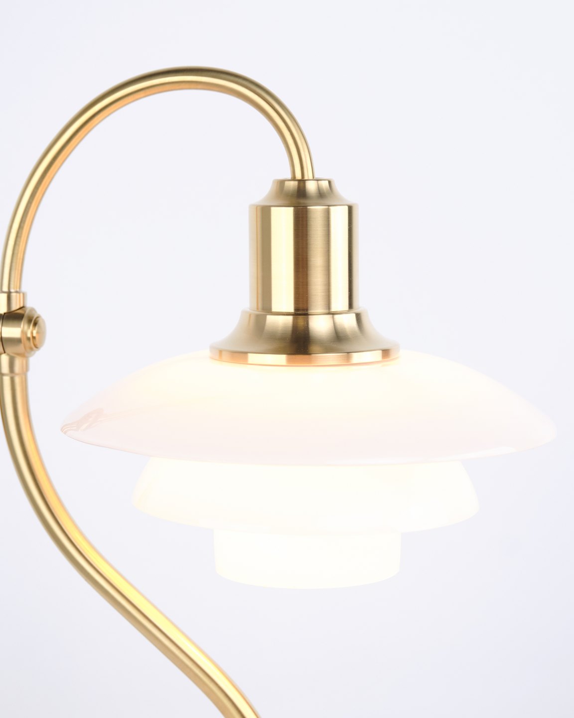 Eksklusiv PH 2/2 “Spørgsmålstegnet” bordlampe designet af Poul Henningsen og udgivet som Limited Edition i 2021 af Louis Poulsen. Lampen er udført i børstet messing med skærme i hvidt opalglas og har den karakteristiske buede form, som har givet modellen sit navn.