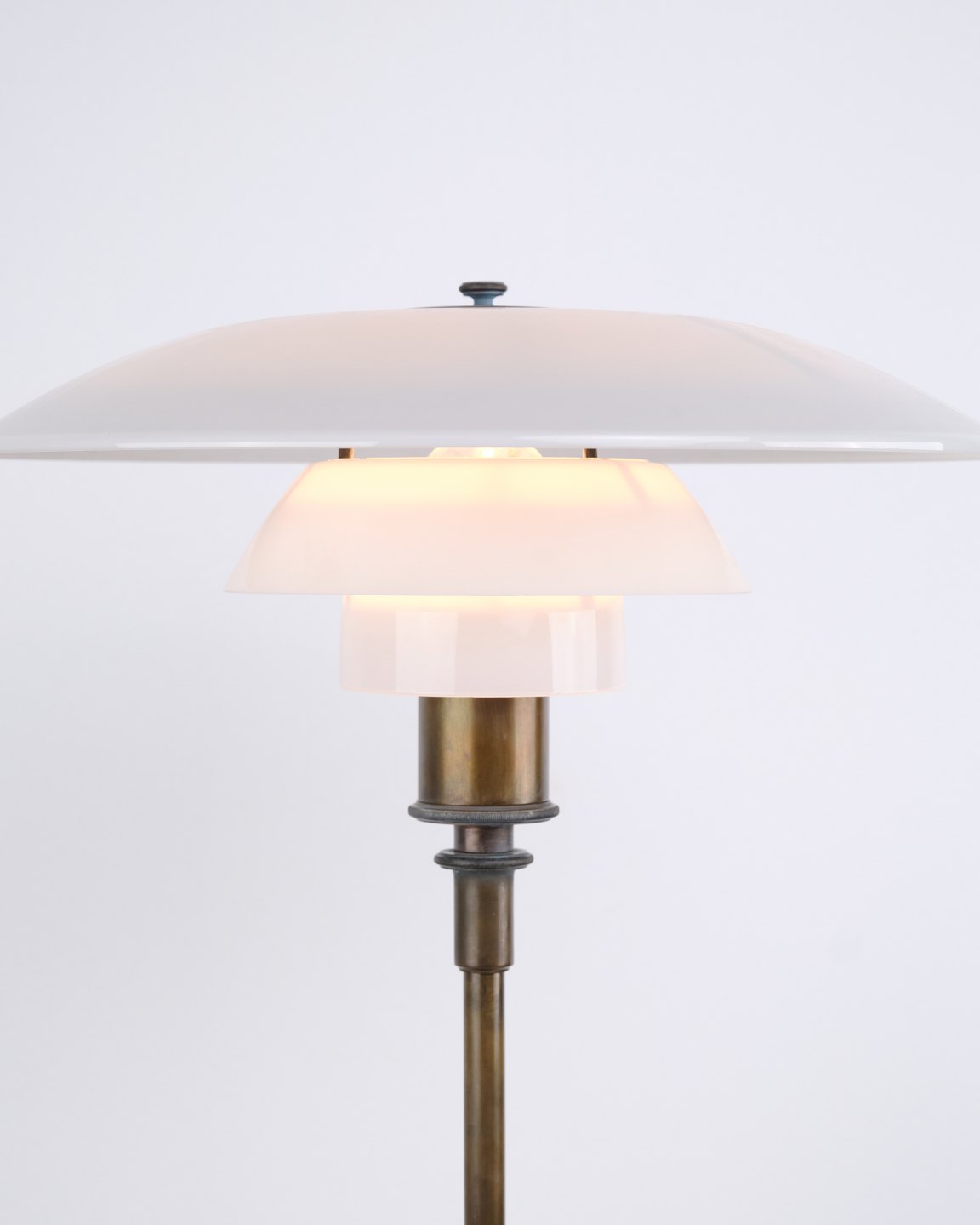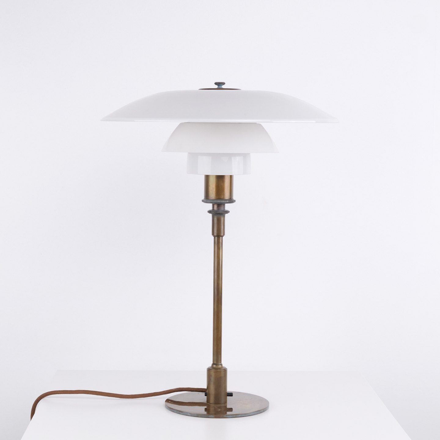 PH 4/3 bordlampe designet af Poul Henningsen og produceret af Louis Poulsen i 1930’erne. Lampen er udført i bruneret messing med skærme i hvidt opalglas, som giver en behagelig og diffust fordelt belysning.