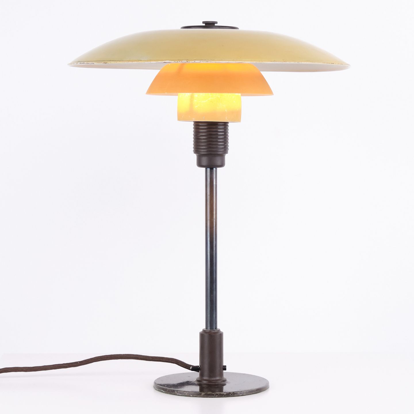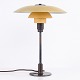 PH 3½/2½ bordlampe designet af Poul Henningsen og fremstillet af Louis Poulsen i 1930’erne. Lampen har gul metal overskærm samt mellem- og bundskærme i gulmalet opalglas, hvilket giver et varmt og karakterfuldt lys. Kombinationen af materialer og farver understreger lampens funktionelle og dekorative udtryk.