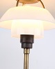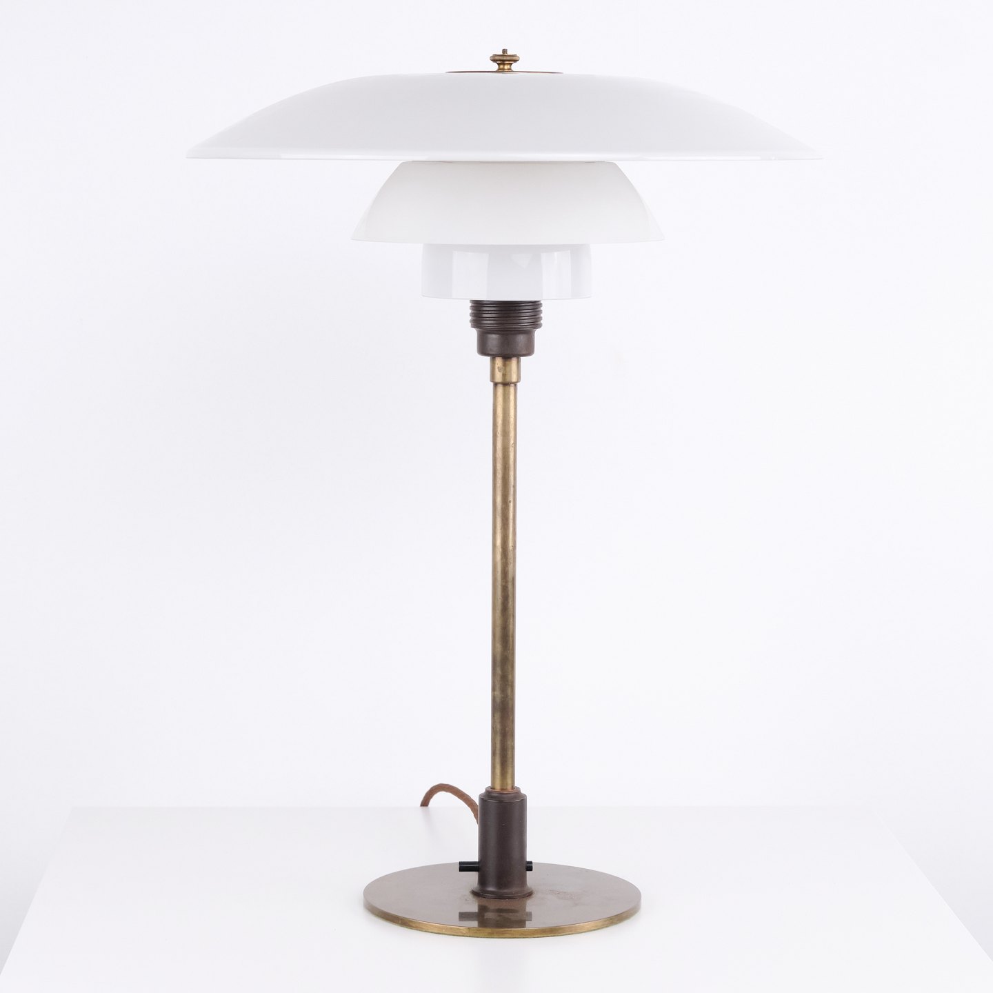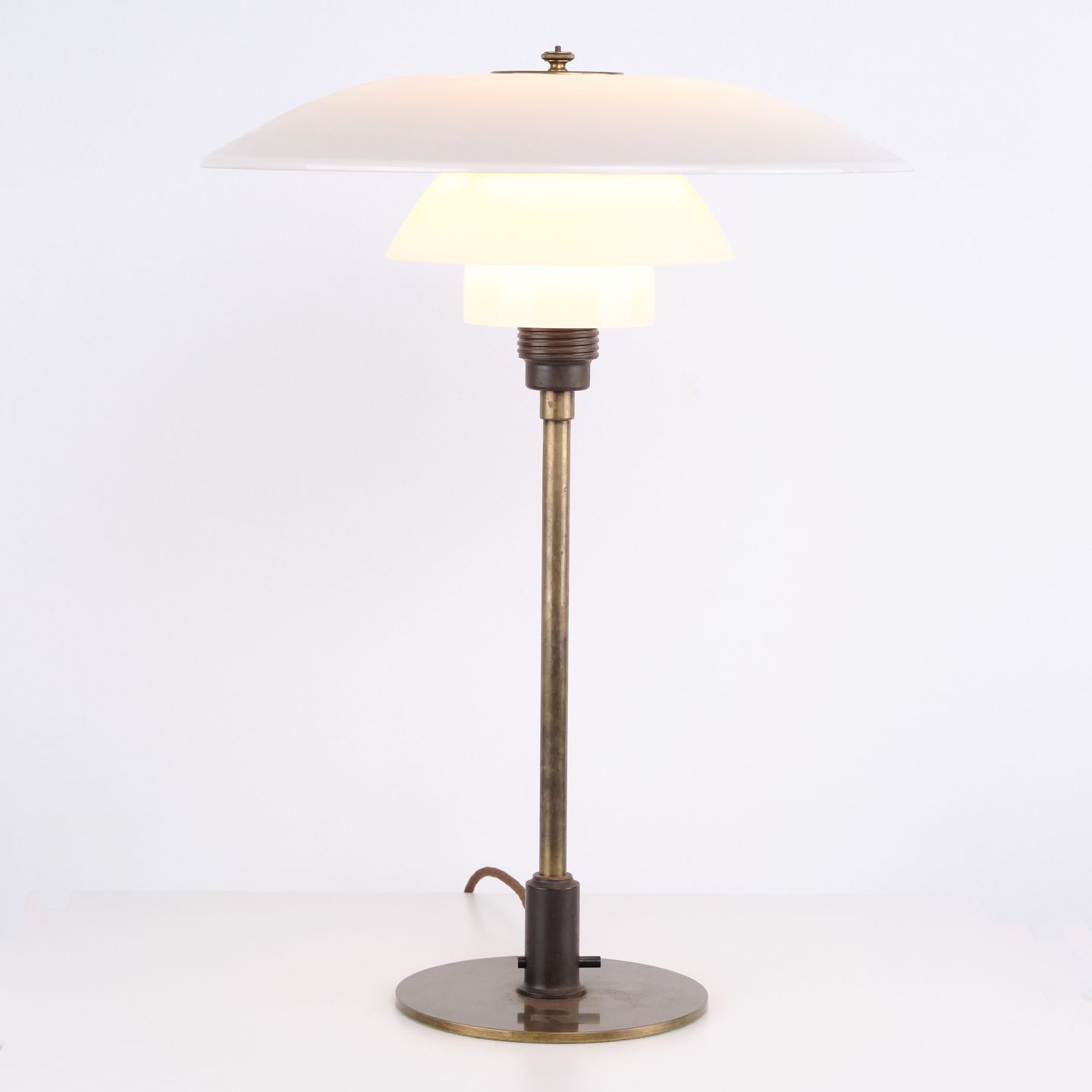 PH 4/3 bordlampe i bruneret messing med opalglas fra Louis Poulsen, 1930’erne. Mærket "Patented" og designet af Poul Henningsen.