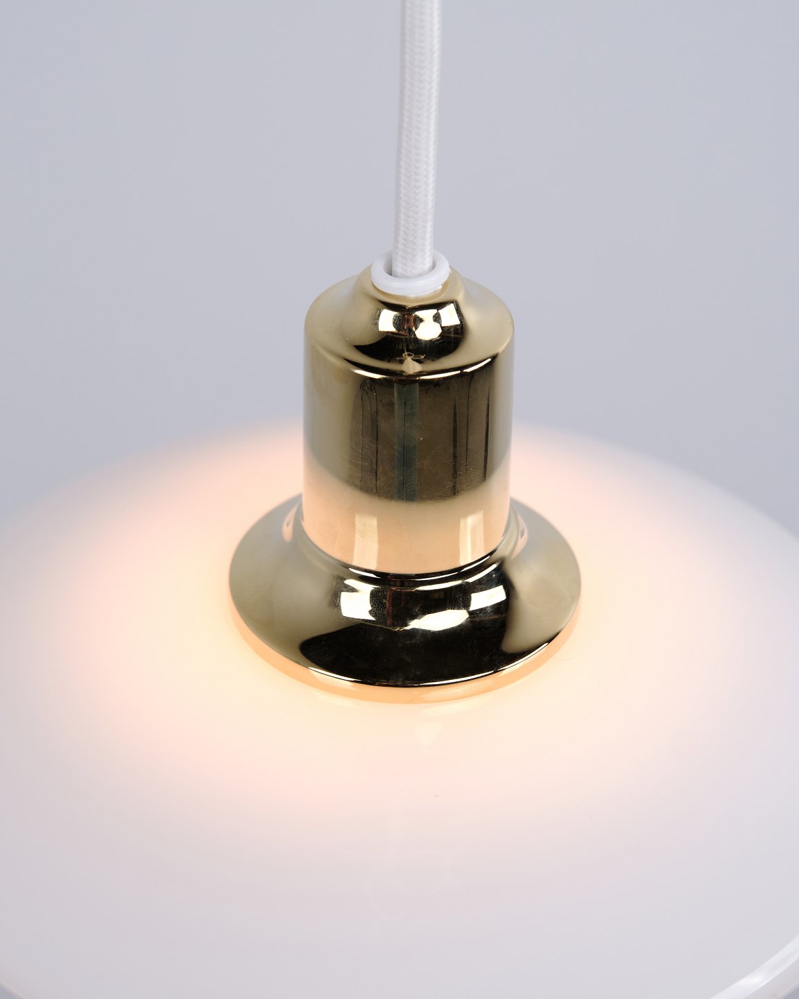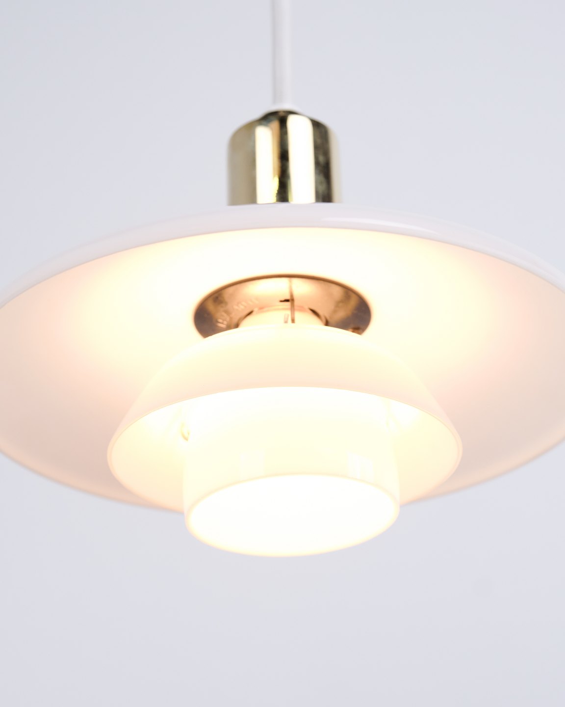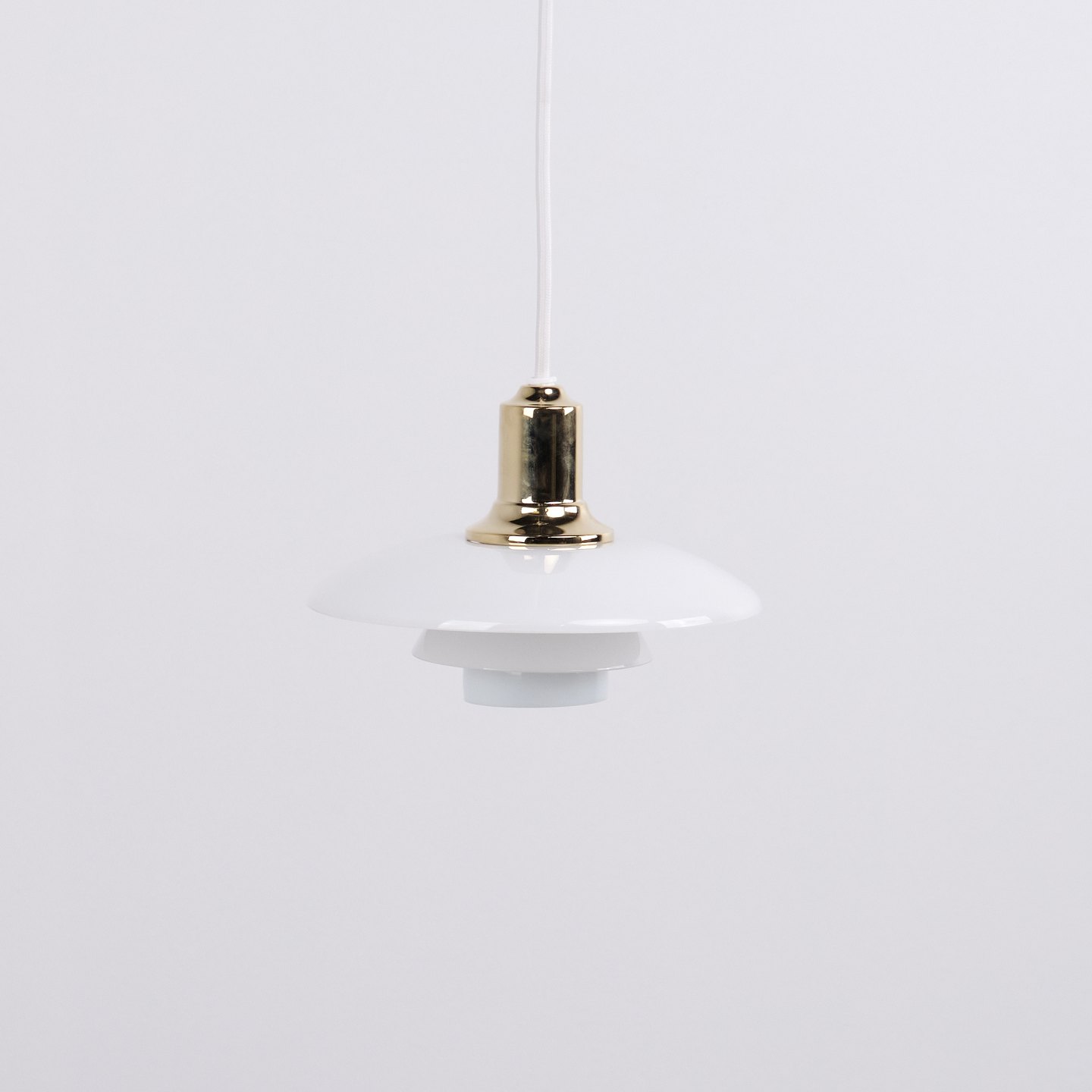 PH 2/1 pendel i messing med opalglas fra Louis Poulsen. Designet af Poul Henningsen med klassisk dansk lysdesign og blændfri belysning.