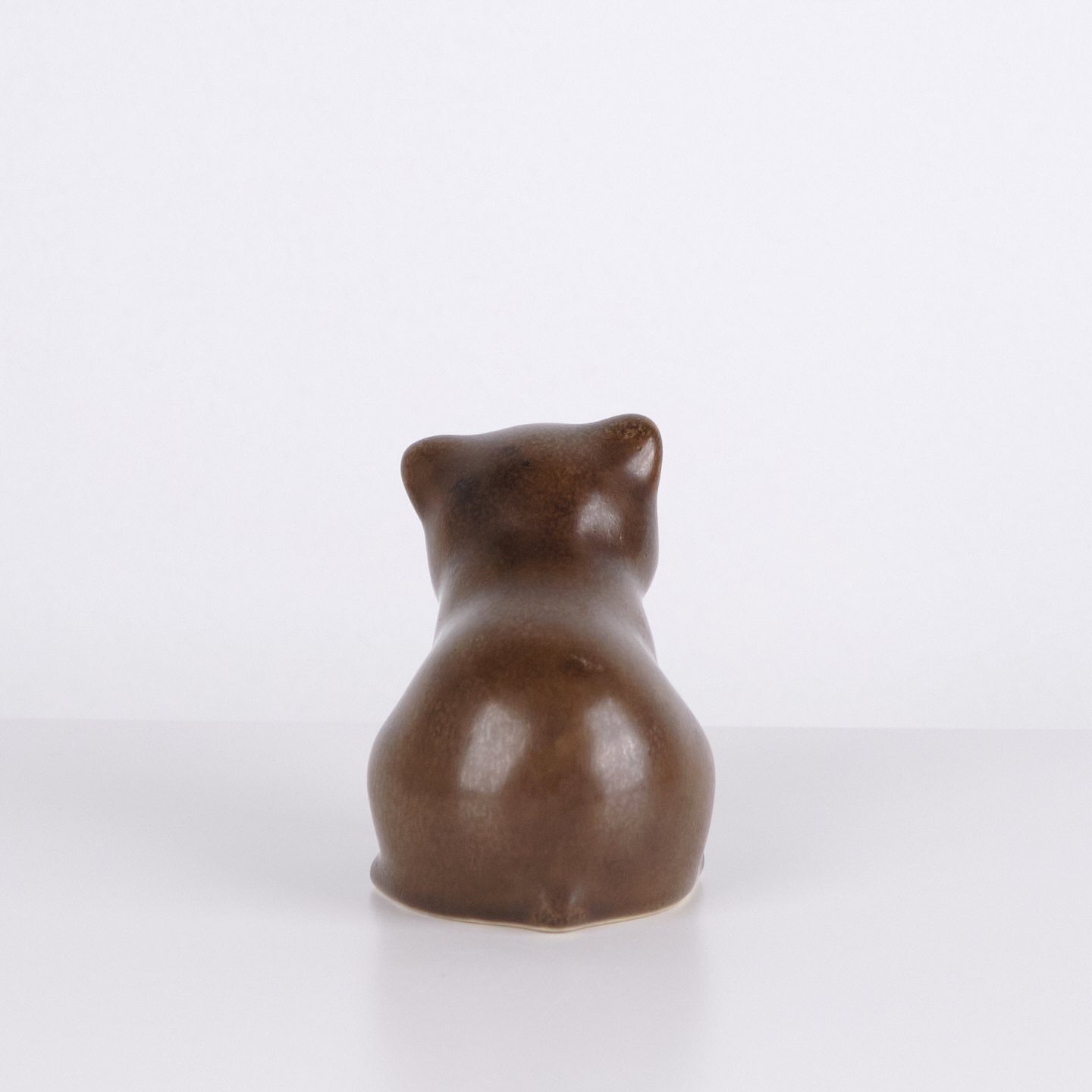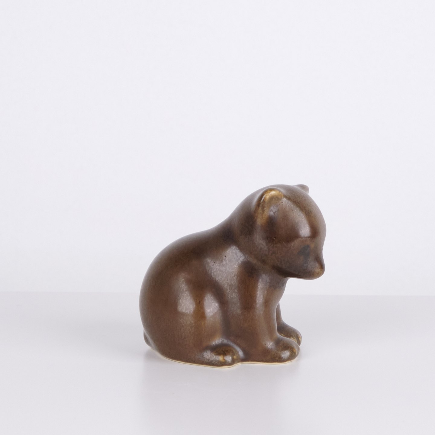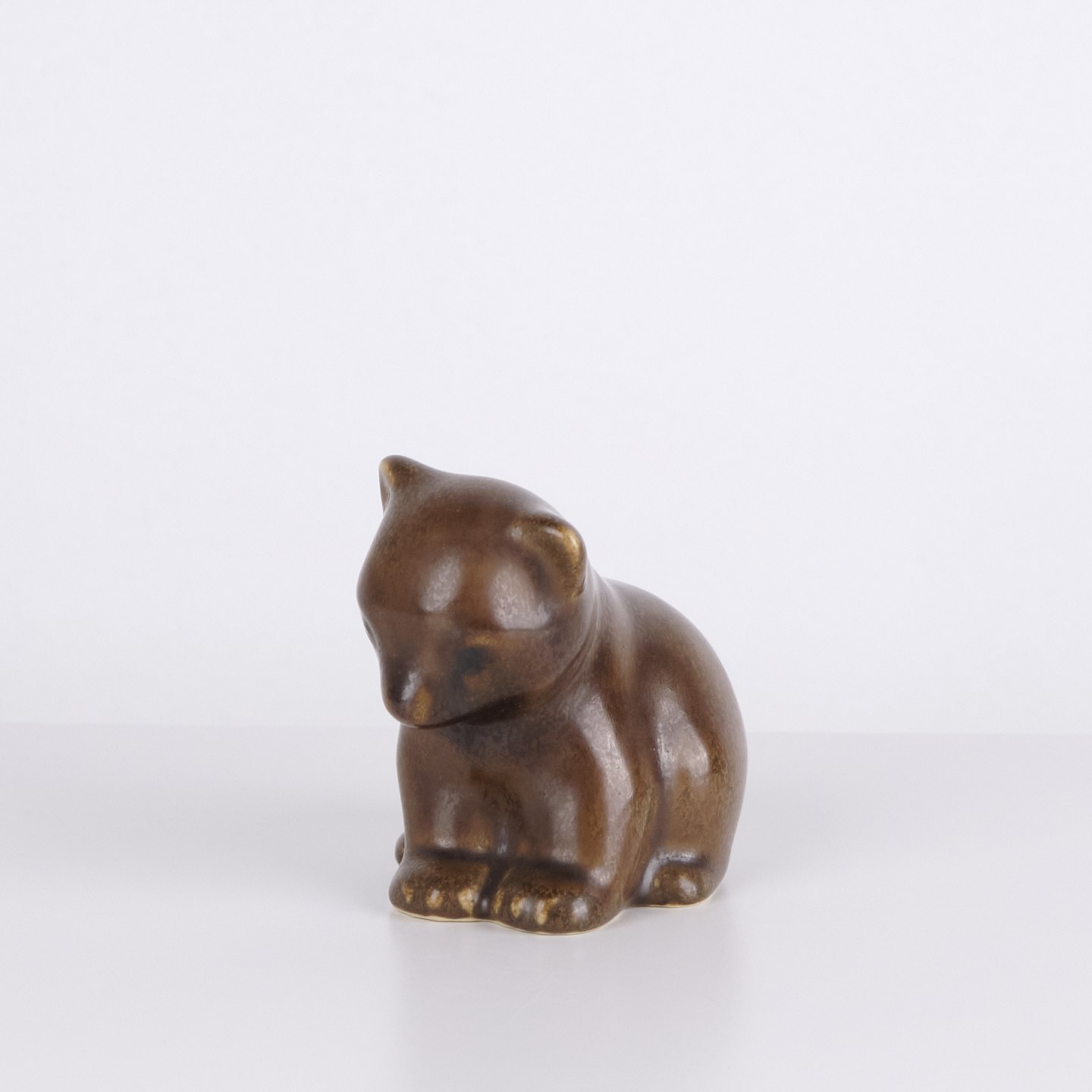 Bjørnefigur af Knud Basse udført i brun glaseret keramik. Figuren er modelleret i siddende form med let bøjet hoved og afrundede linjer, som giver et roligt og karakterfuldt udtryk. Et fint eksempel på Knud Basses populære dyrefigurer og dansk kunstkeramik fra midcentury perioden.