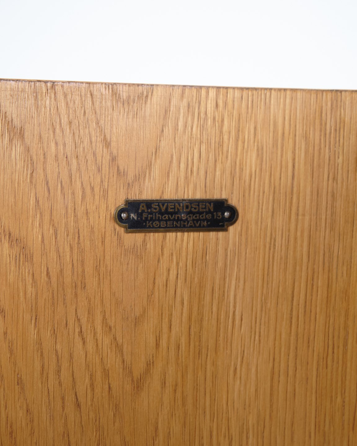 Buet skænk fremstillet af P. Svensen, N. Frihavnegade 15, København. Møblet er udført i malet træ med profilerede detaljer, forgyldte dekorationer og original marmorplade. Fronten har åben midterniche, lille skuffe samt to buede skabe med indvendige hylder. Klassisk empireinspireret form med buede sider, svungne ben og dekorative beslag. Velegnet som entrémøbel, konsol eller opbevaringsskænk.