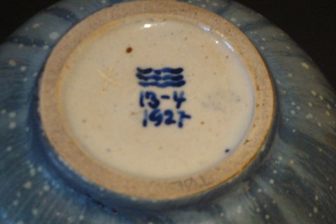 Lågvase, kgl i grøn/blå farve. Dateret