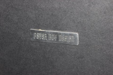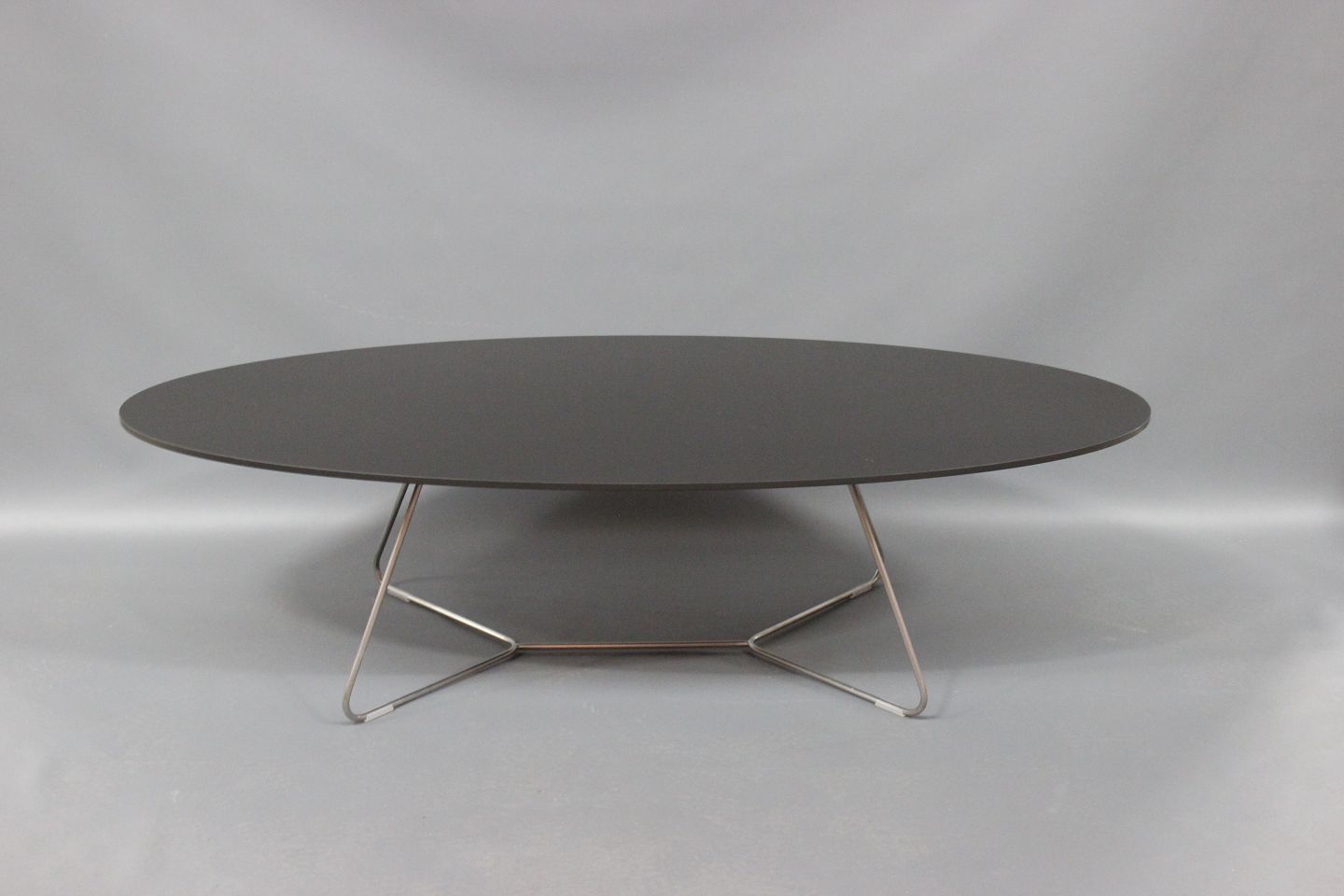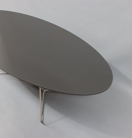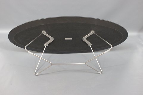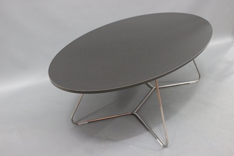 SolgtSofabord designet af Peter Boy, model E1. Bordpladen er i sort linoleum og stellet er i børstet rustfri stål .