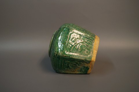 Kantet keramik vase med mørkegrøn glasur fra 1940erne af en ukendt keramiker.