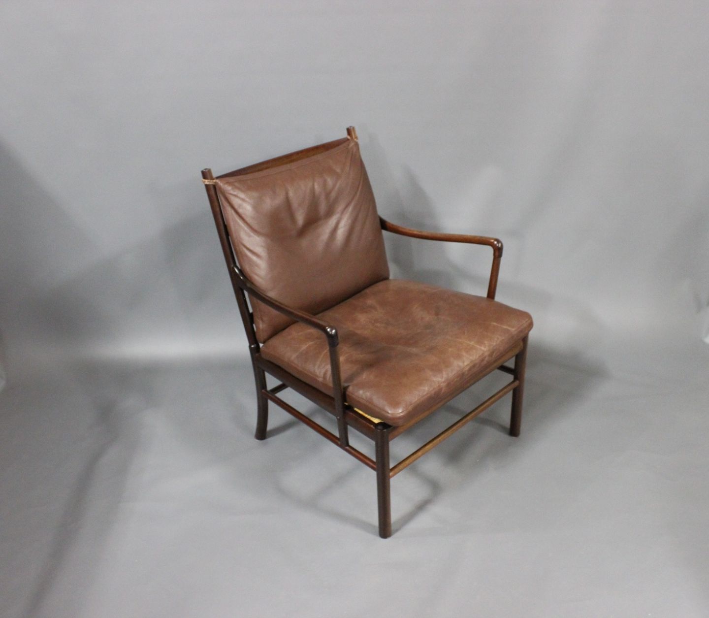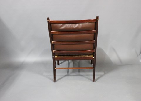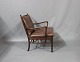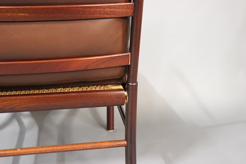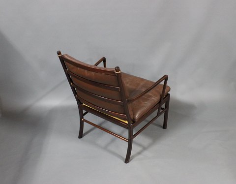 "Colonial" stol, model PJ149, designet af Ole Wanscher i 1949 og produceret af P. Jeppesen. Stolen er af mahogni og med brune læder hynder.