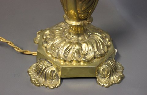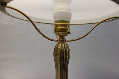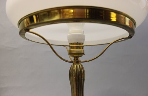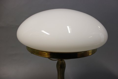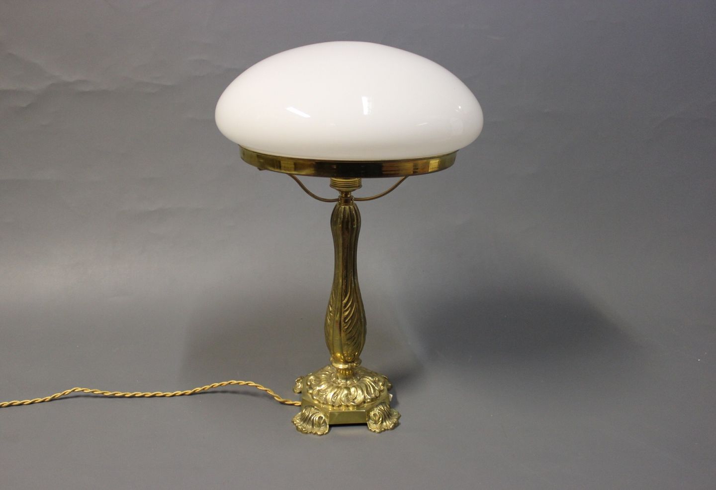 Bordlampe i messing med flot udsmykket fod og hvid glas kuppel. Lampen er i Jugendstil fra 1920erne.