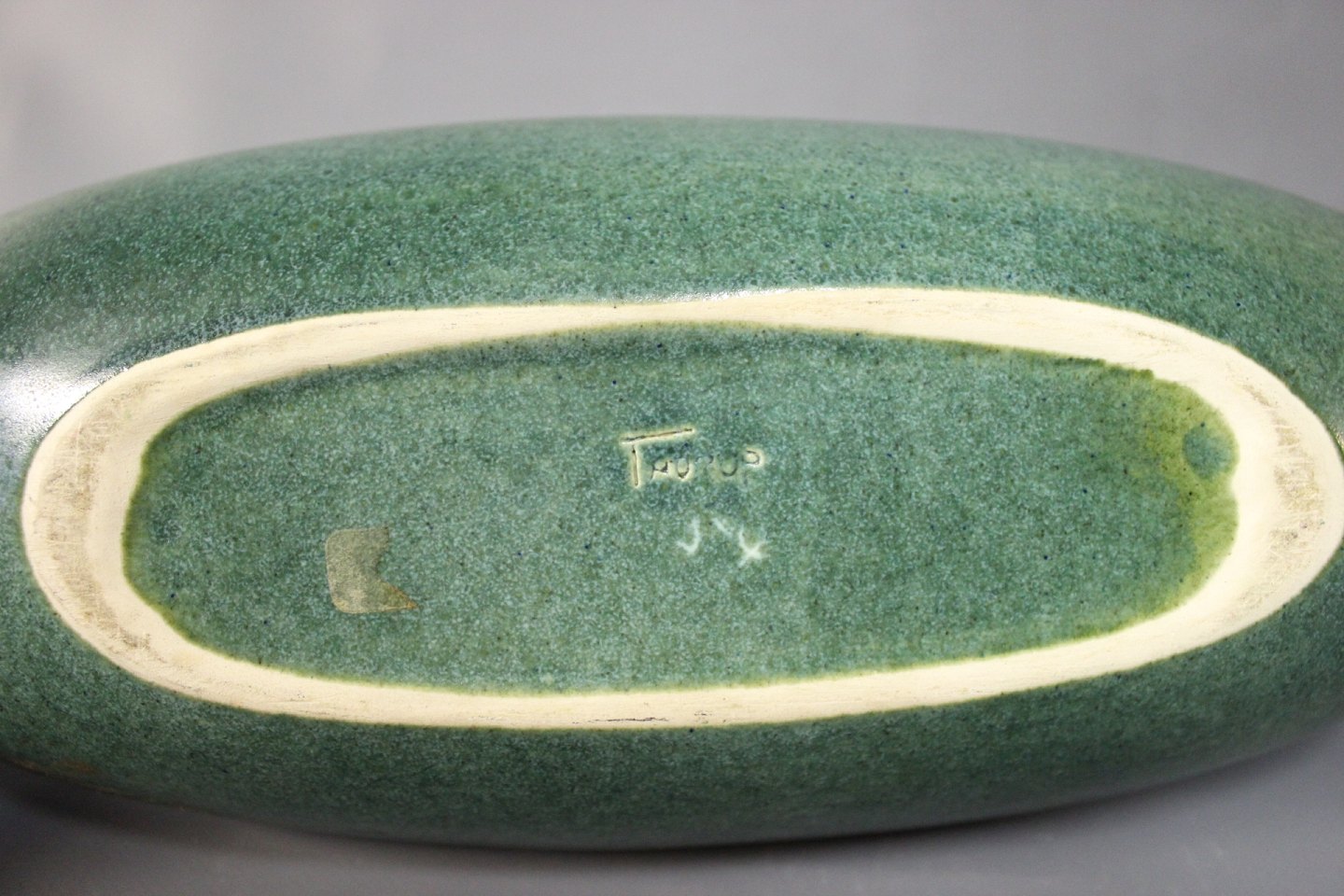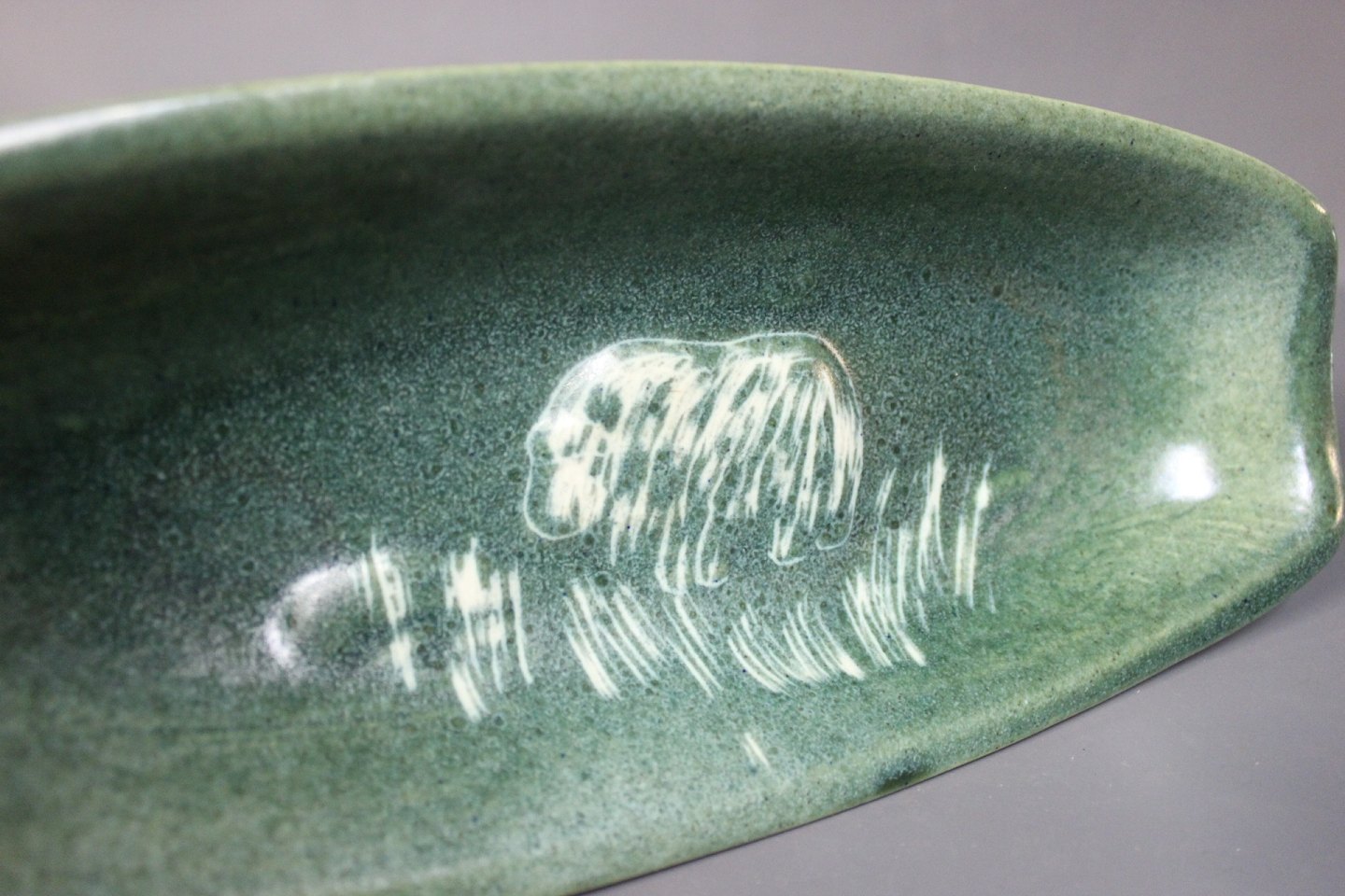 Aflangt mørkegrønt keramik fad med dyremotiv fra Thorup.