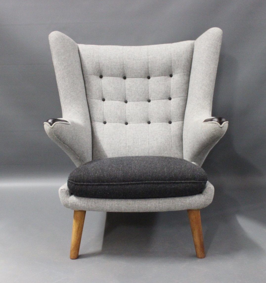 SoldPapa Bear chair, model AP 19, and stool model PP120, designed by Hans J. Wegner in 1951/54 and manufactured by A.P. Møbler. The chair is upholstery in light and dark grey Hallingdal wool, legs and paws of teak.