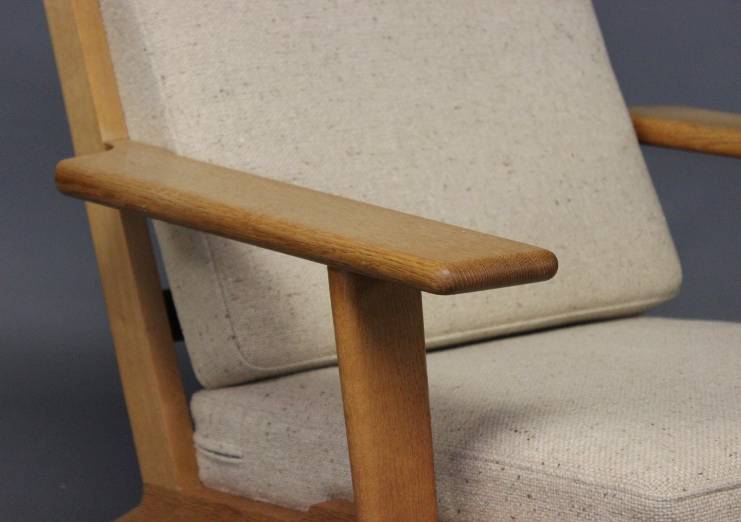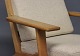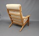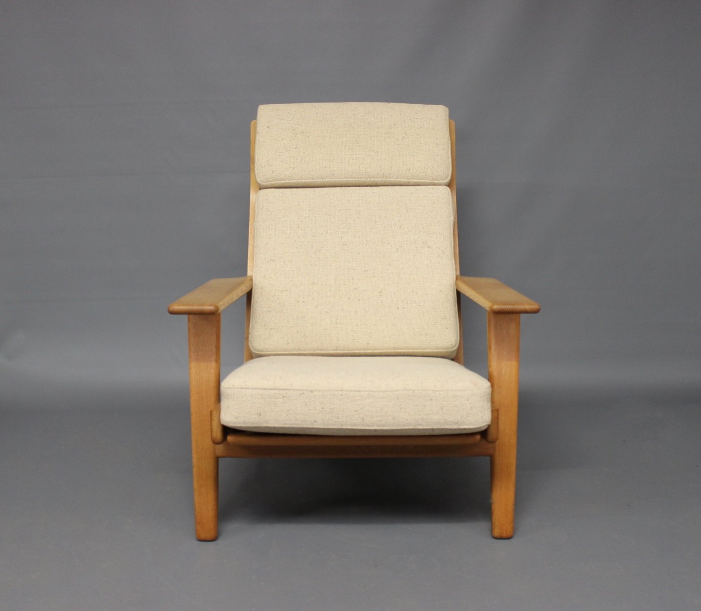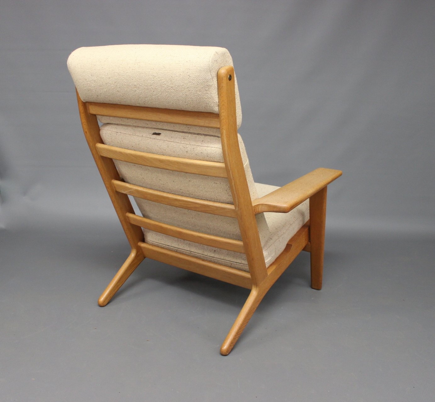Armstol med høj ryg, model GE290A, designet af Hans J. Wegner i 1950erne og fremstillet hos GETAMA i 1960erne. Stolen er lavet af eg og hynderne er polstret i lyst Hallingdal uld.