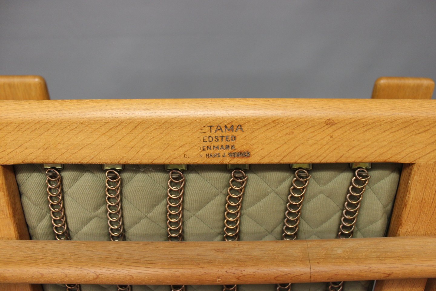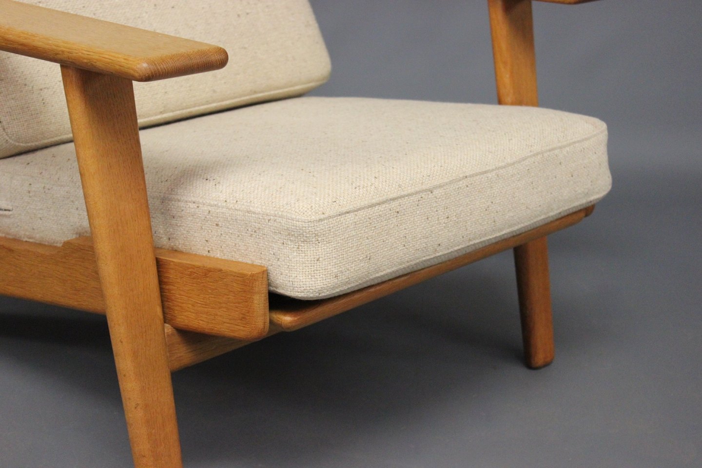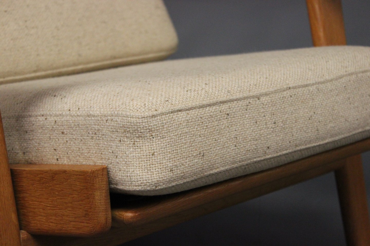 Armstol med høj ryg, model GE290A, designet af Hans J. Wegner i 1950erne og fremstillet hos GETAMA i 1960erne. Stolen er lavet af eg og hynderne er polstret i lyst Hallingdal uld.