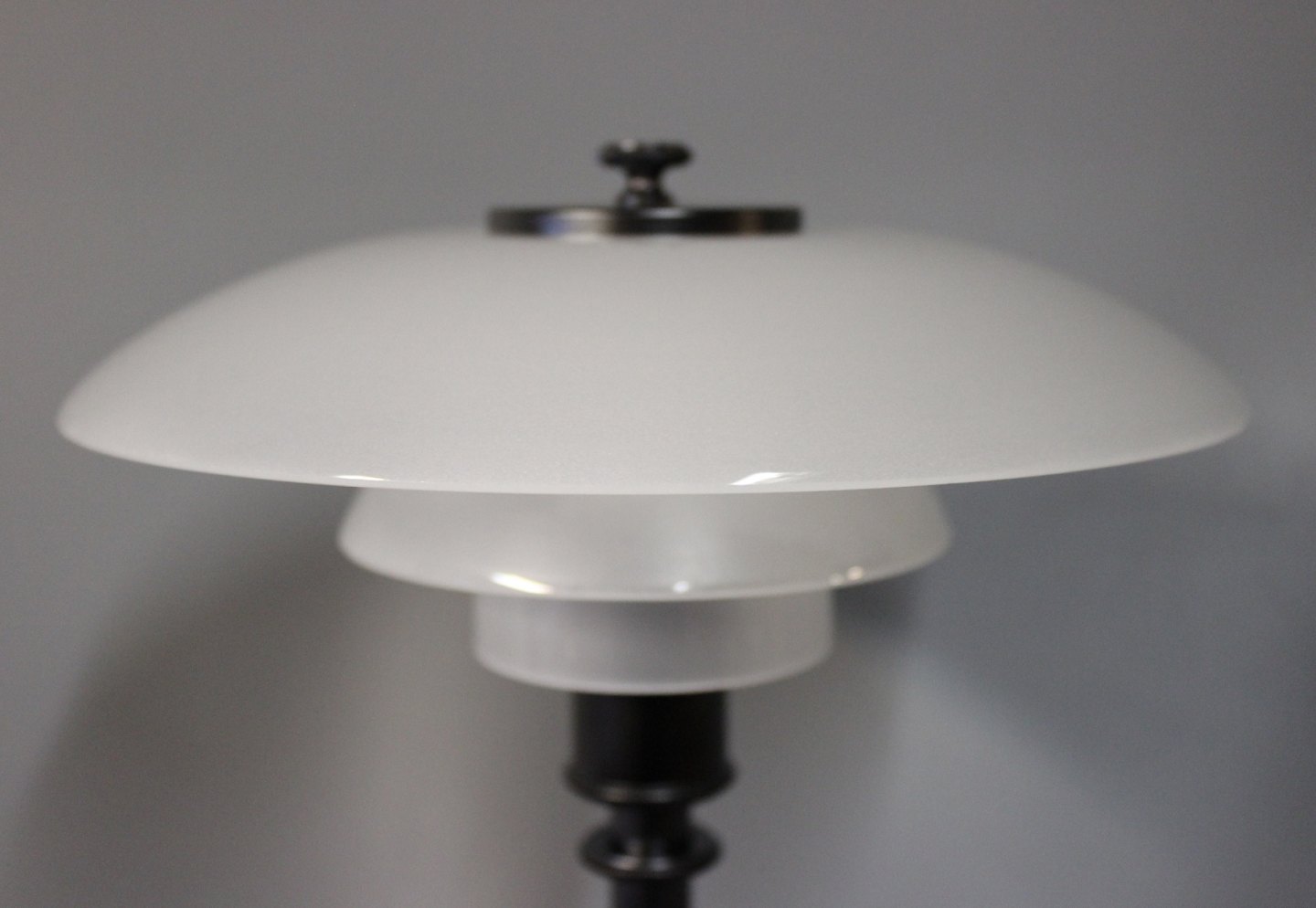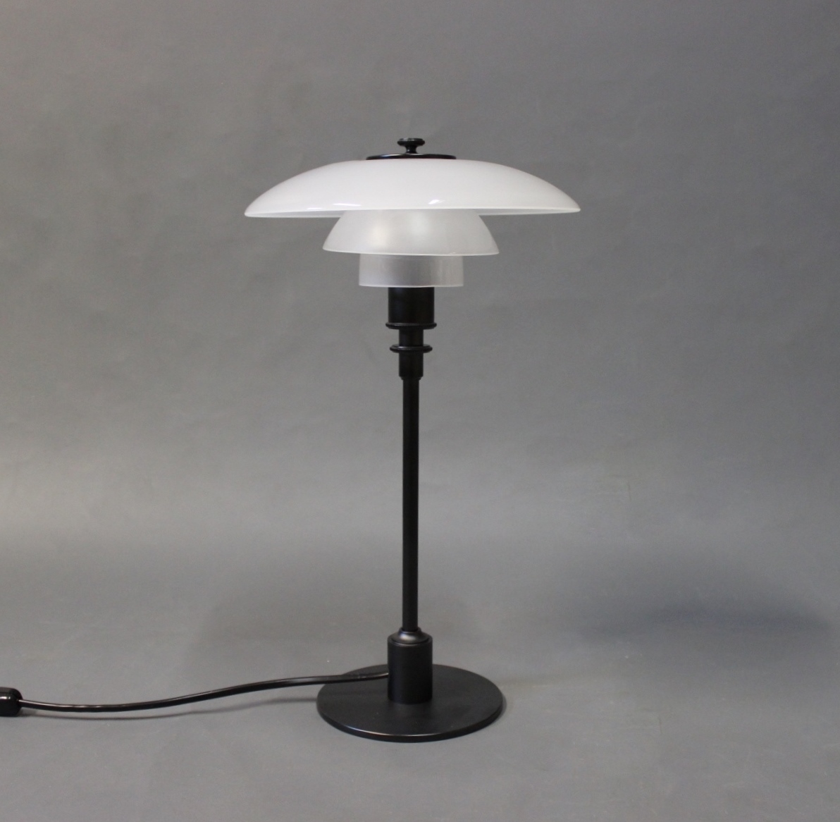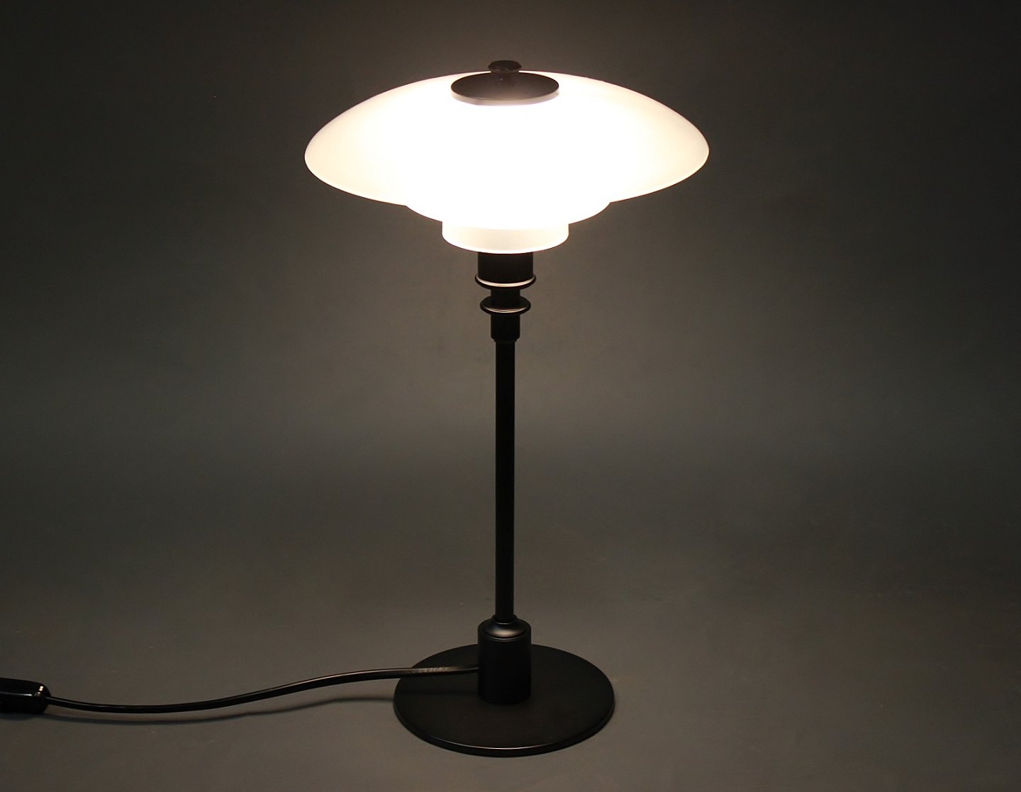 PH 2/1 bordlampe, jubilæums model, designet af Poul Henningsen og fremstillet hos Louis Poulsen. Lampen er med skærme af mat opalglas og sort lakeret stel.