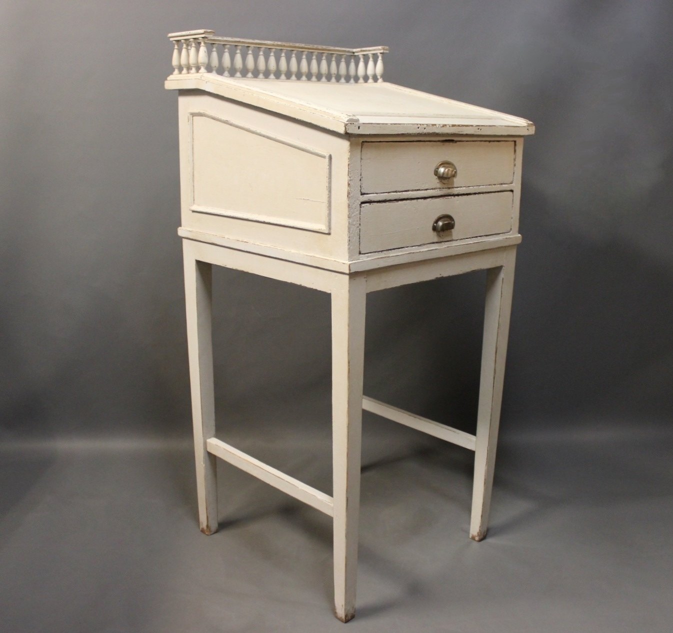 Gråmalet skrivepult i stilen gustaviansk fra 1840erne. Skrivepulten er fritstående samt er den stemplet med Nordisk Films Kompagni.