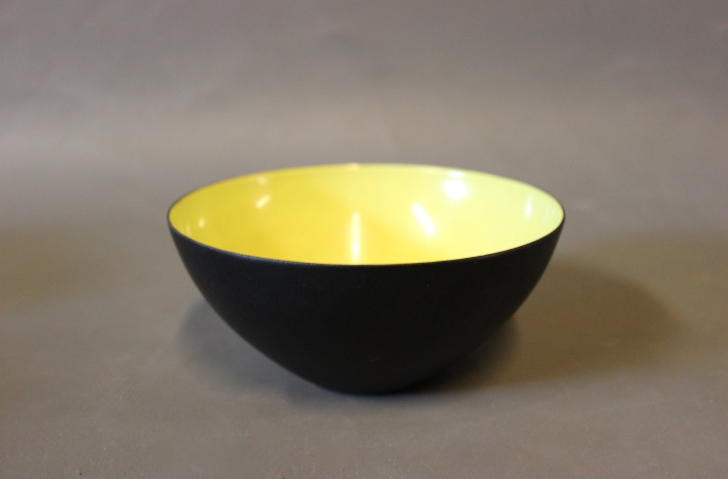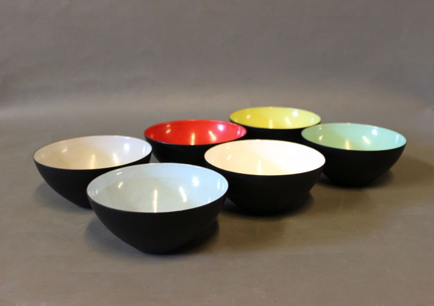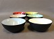 Små krenit skåle af Herbert Krenchel i sort metal og forskellig farvet emalje.