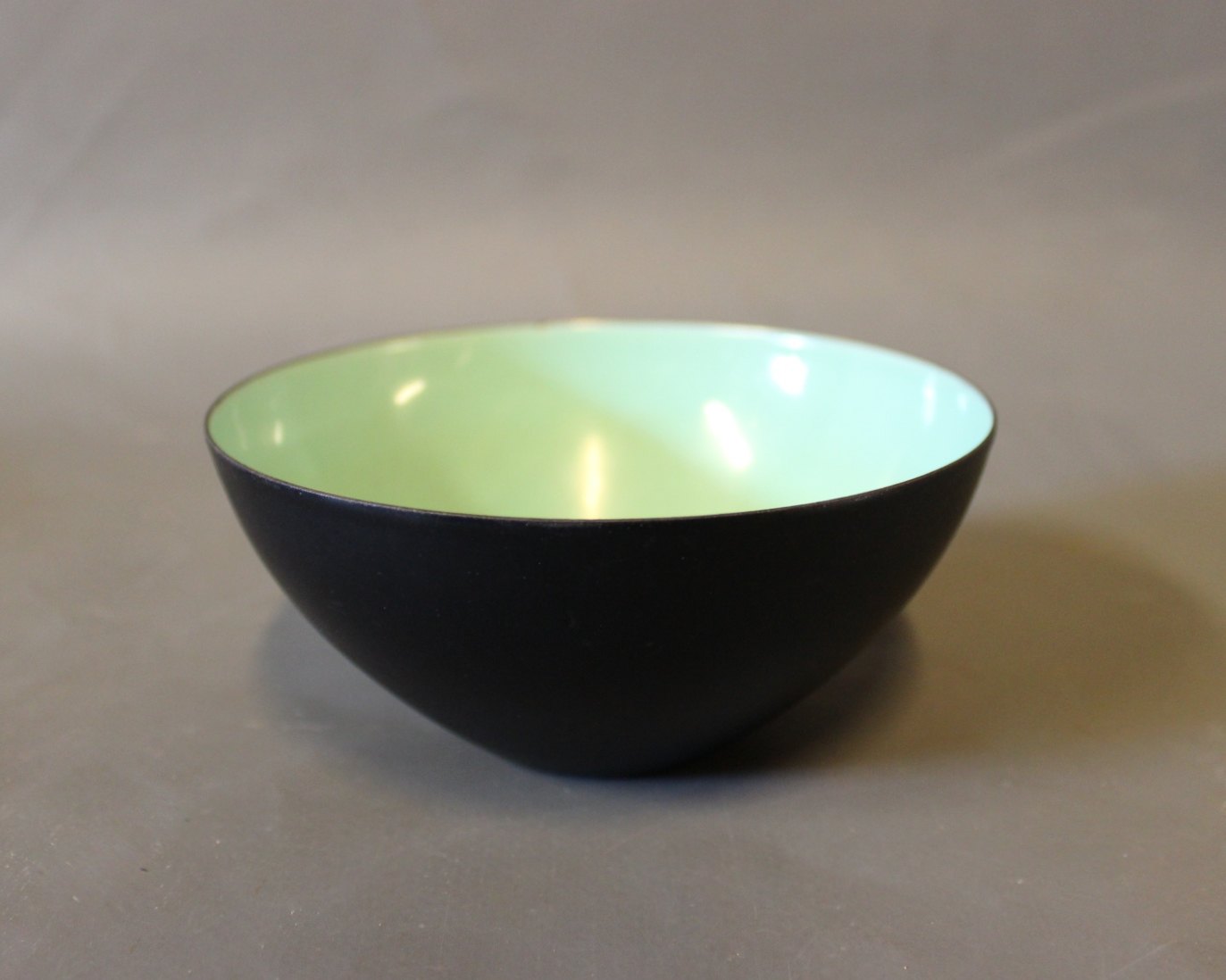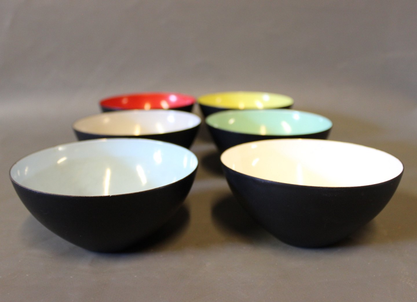 Små krenit skåle af Herbert Krenchel i sort metal og forskellig farvet emalje. Skålene er fra 1960erne. Den blå og den røde er solgt.