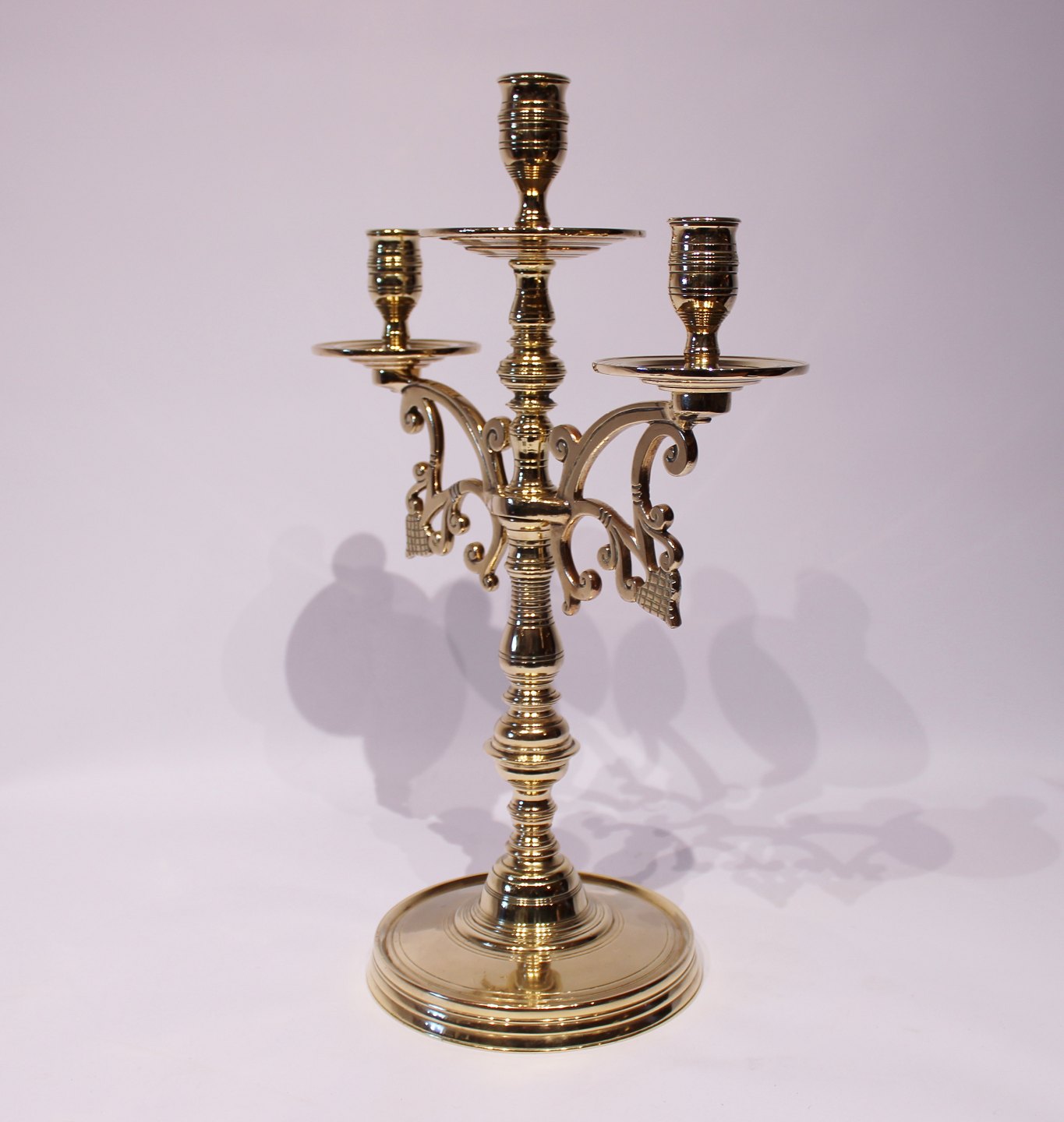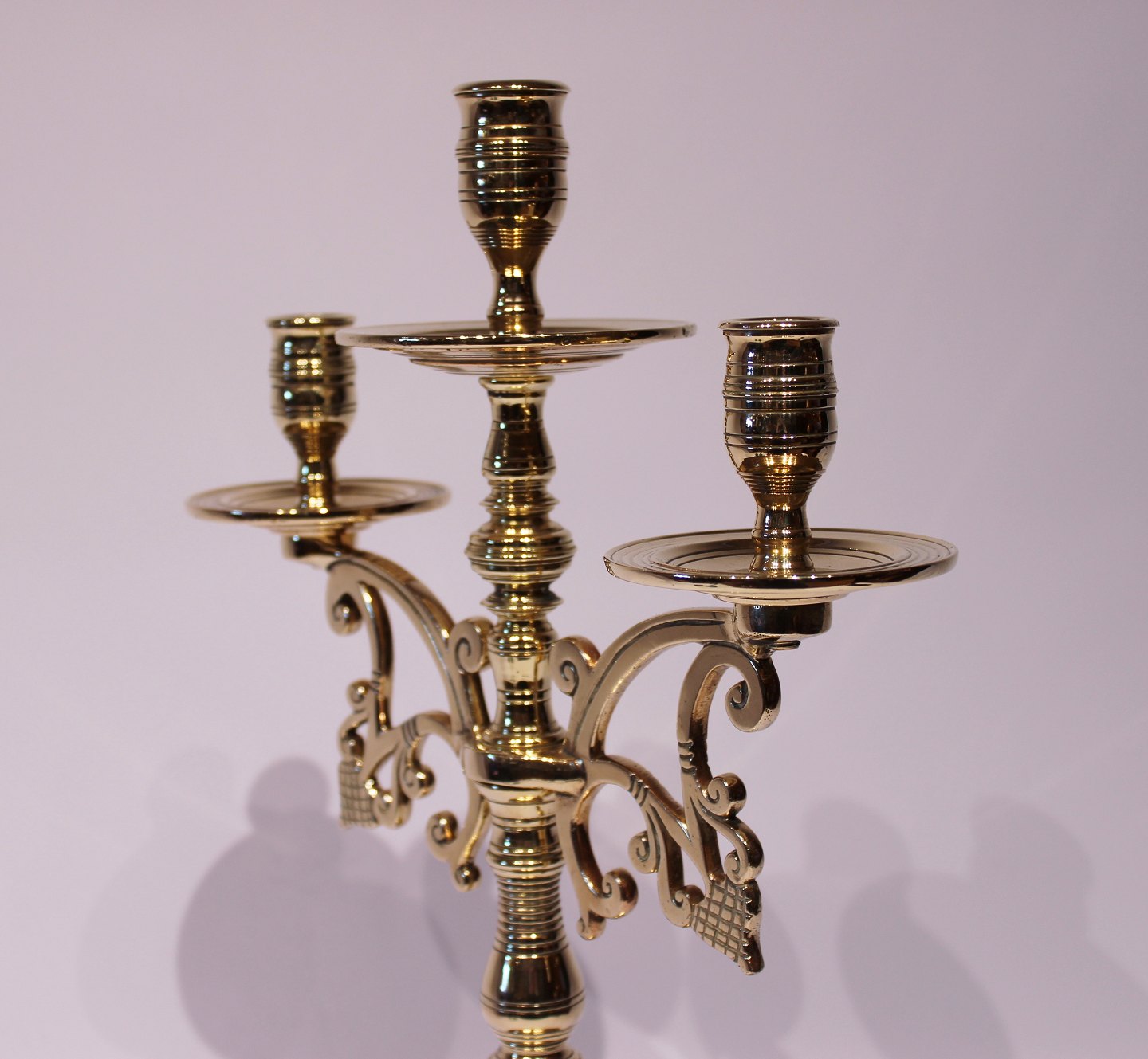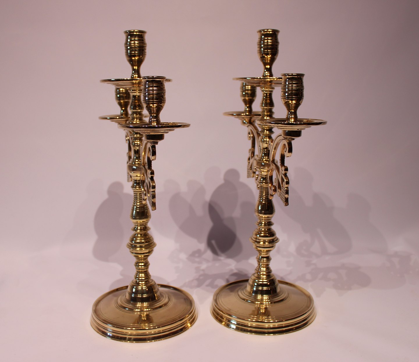 SolgtEt sæt store trearmede messing lysestager, i flot brugt stand fra omkring 1890erne.