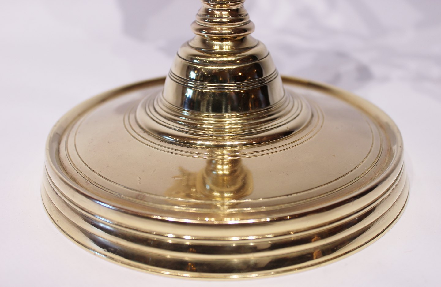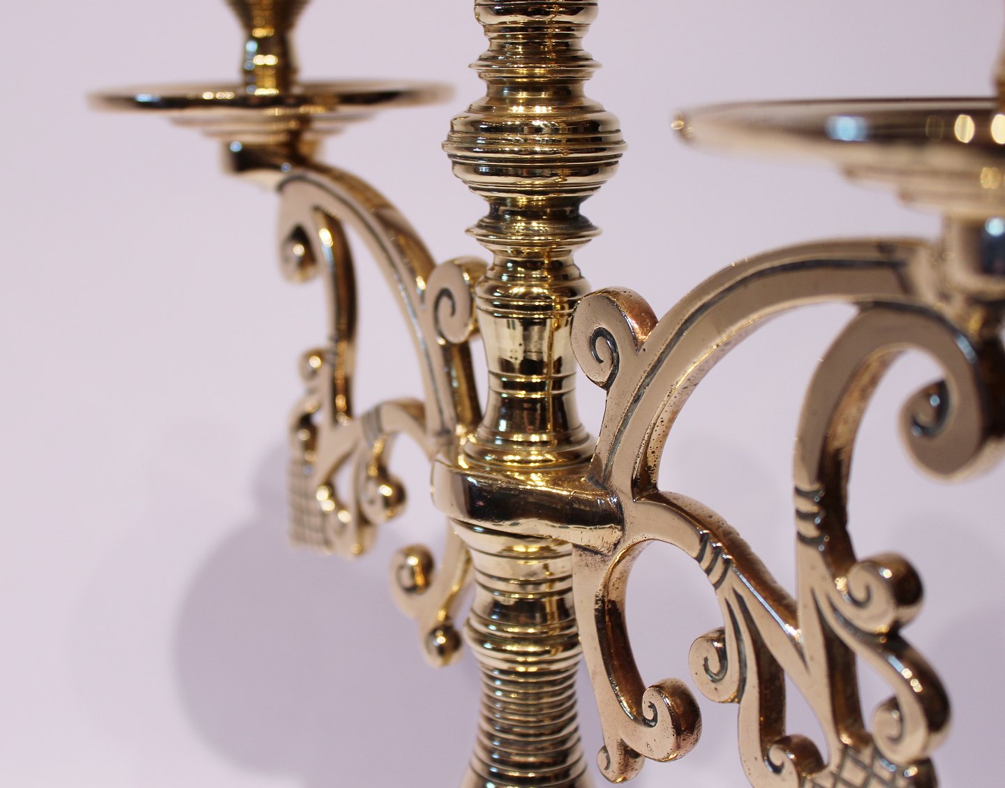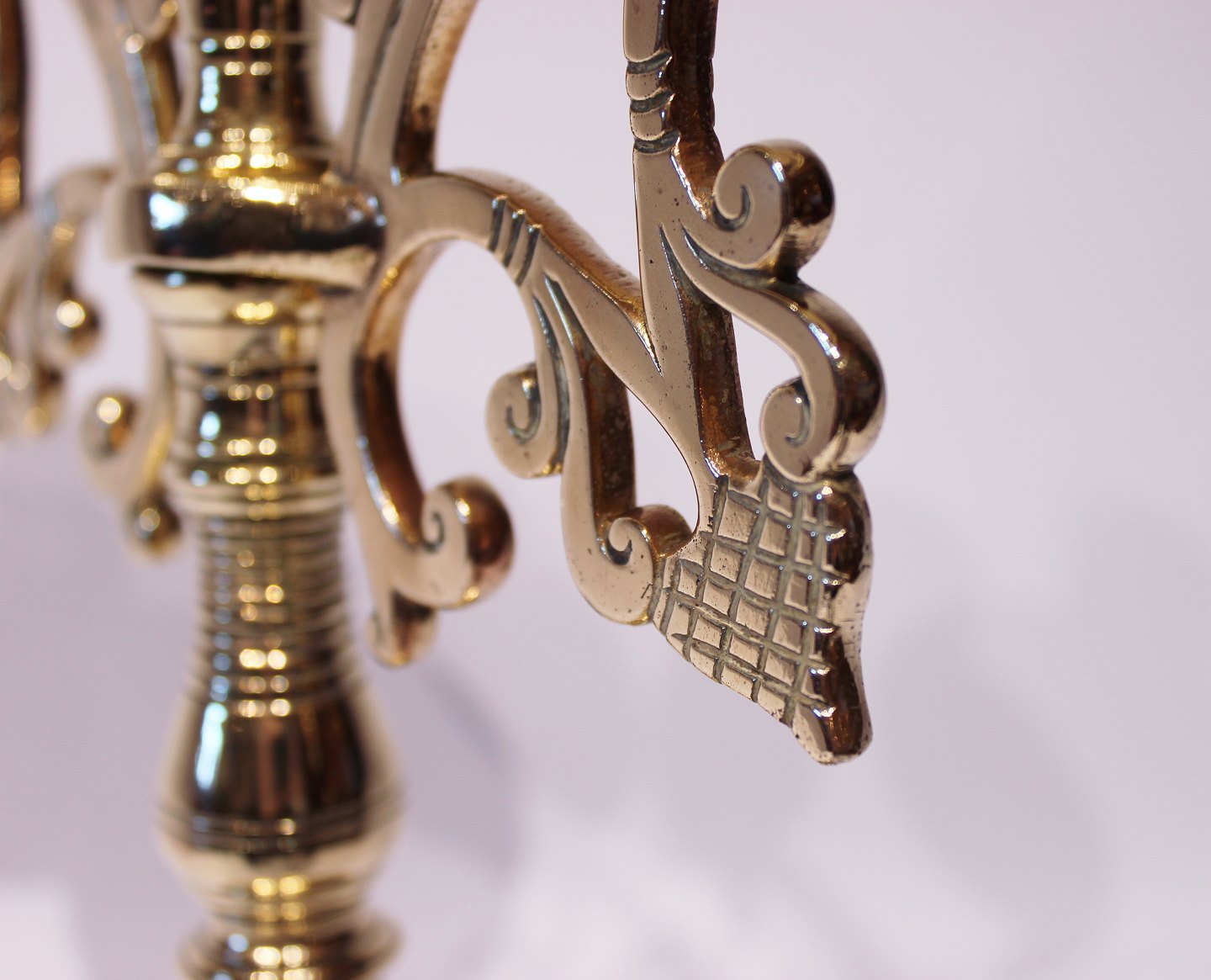 SolgtEt sæt store trearmede messing lysestager, i flot brugt stand fra omkring 1890erne.