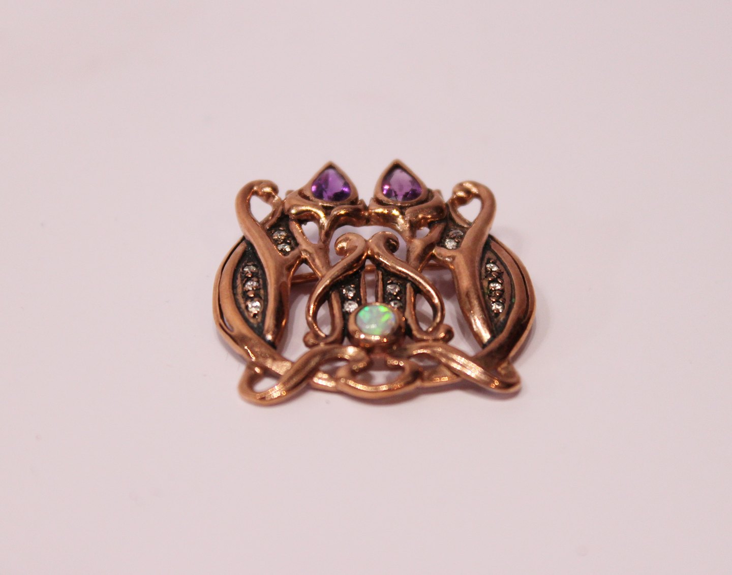 Fin broche dekoreret med forskellige sten.