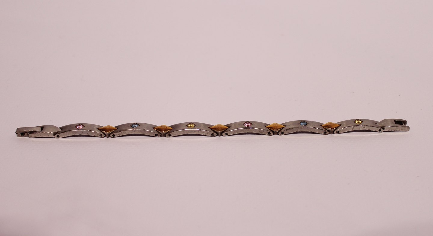 Armkæde med farvet sten, af stål og stemplet Inox.
