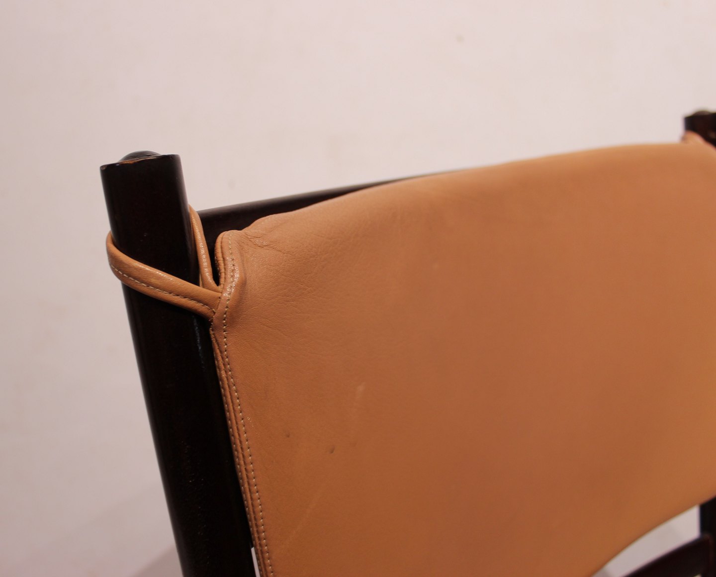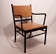 SolgtHvilestol i mahogni og lysebrunt læder designet af Ole Wanscher og fremstillet af P. Jeppesen. Stolen er i flot brugt stand.