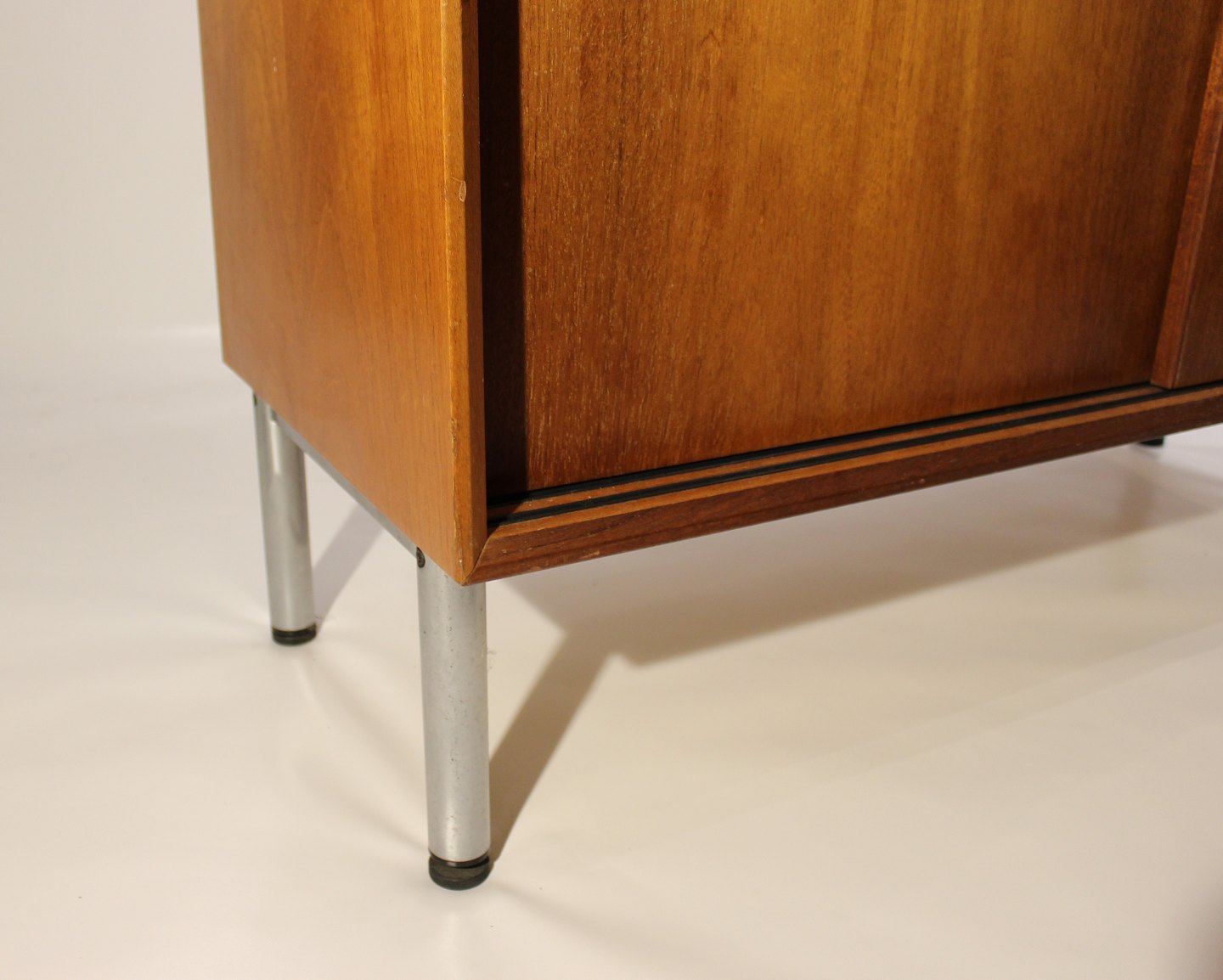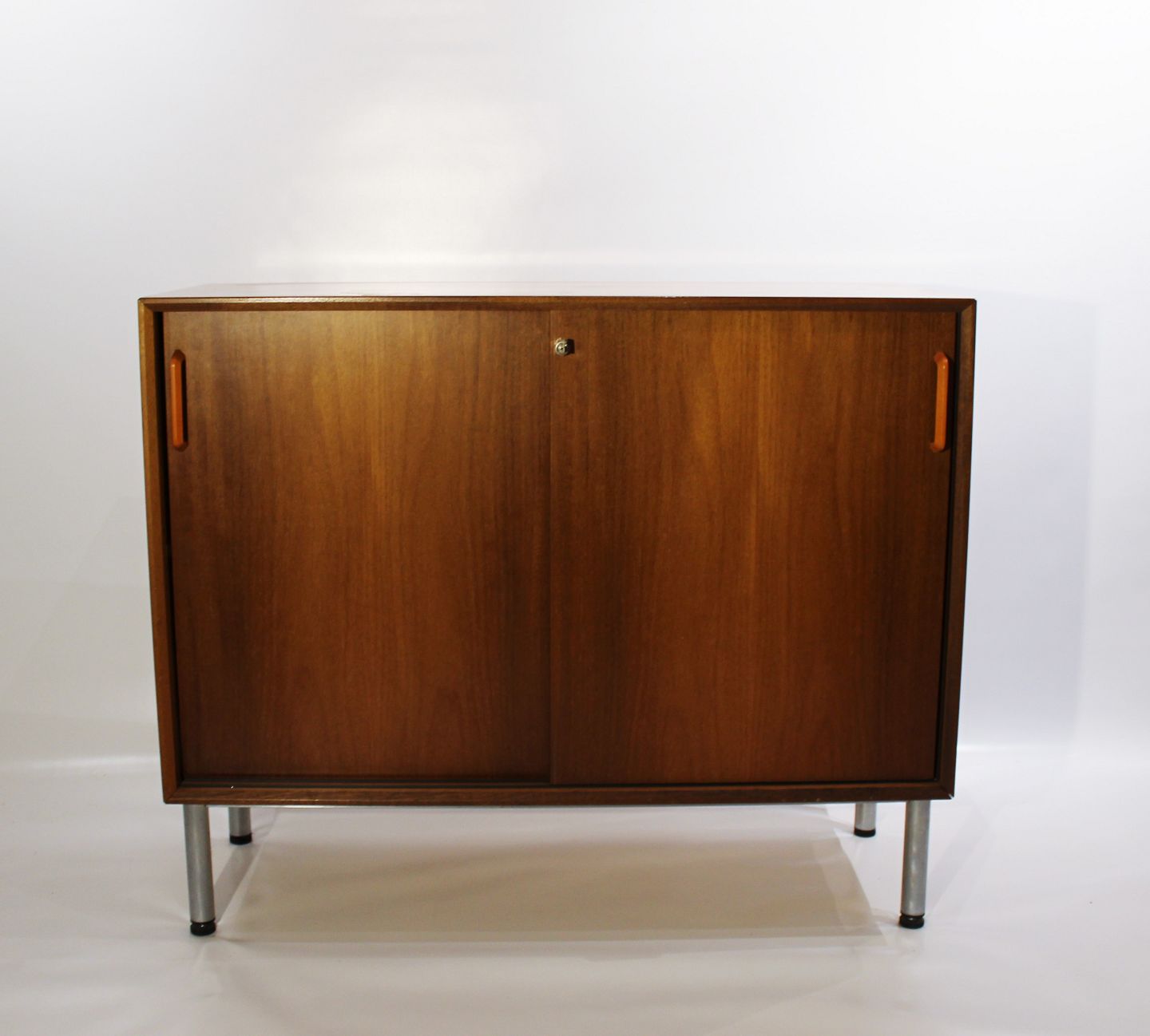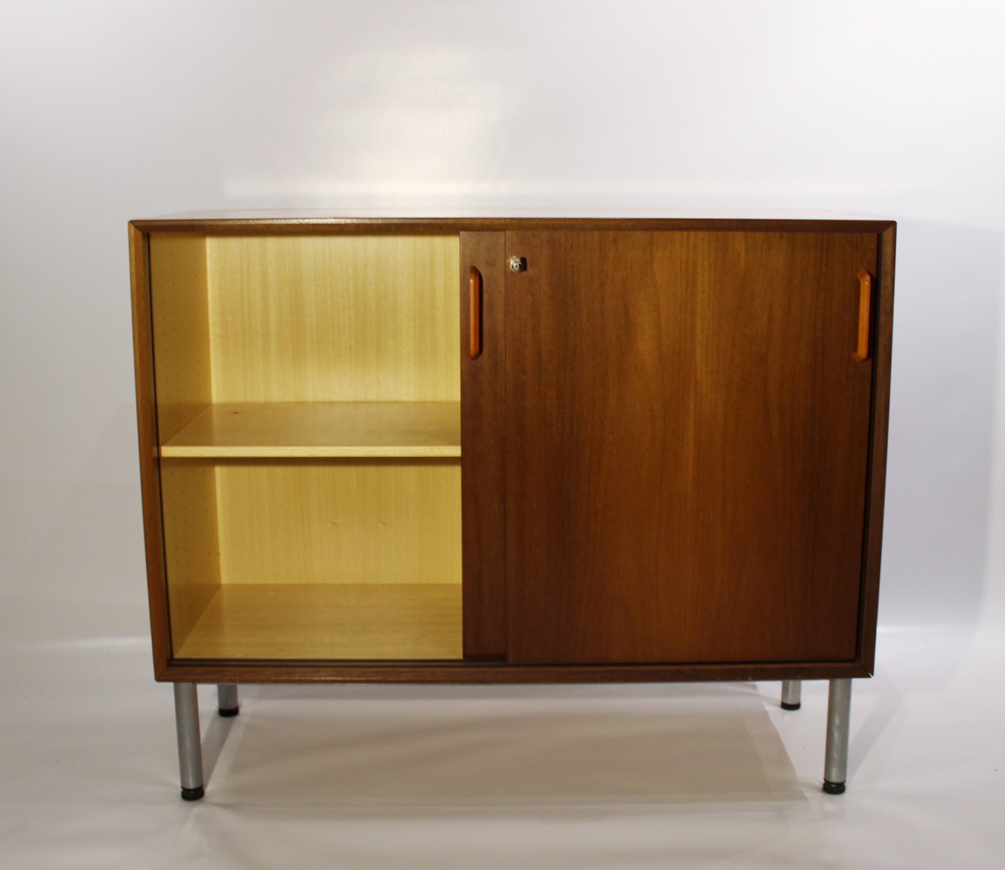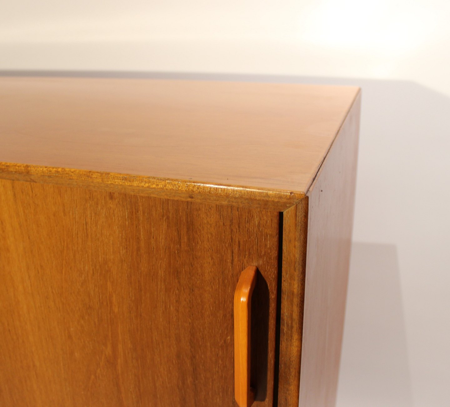 This cabinet with sliding doors in light mahogany is a characteristic example of Danish design from the 1960s. With its elegant and functional design, it fits perfectly with the period aesthetics of this era. The cabinet's sliding doors make it ideal for saving space while adding a touch of vintage charm to any room.